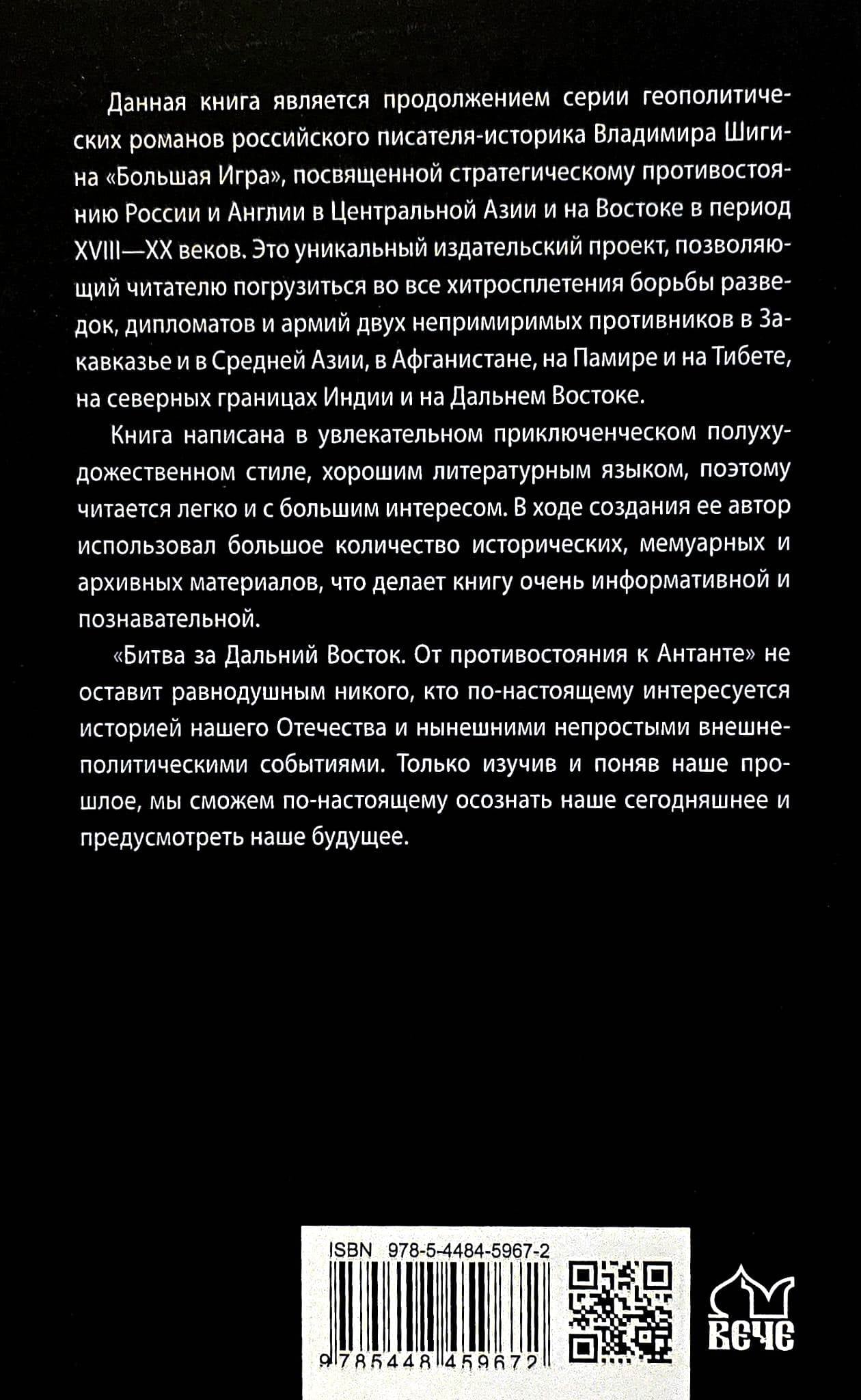 Данная книга является продолжением серии геополитических романов российского писателя-историка Владимира Шигина «Большая Игра», посвященной стратегическому противостоянию России и Англии в Цент­ральной Азии и на Востоке в период XVIII—XX веков. Это уникальный издательский проект, позволяющий читателю погрузиться во все хитросплетения борьбы разведок, дипломатов и армий двух непримиримых противников в Закавказье и в Средней Азии, в Афганистане, на Памире и на Тибете, на северных границах Индии и на Дальнем Востоке.