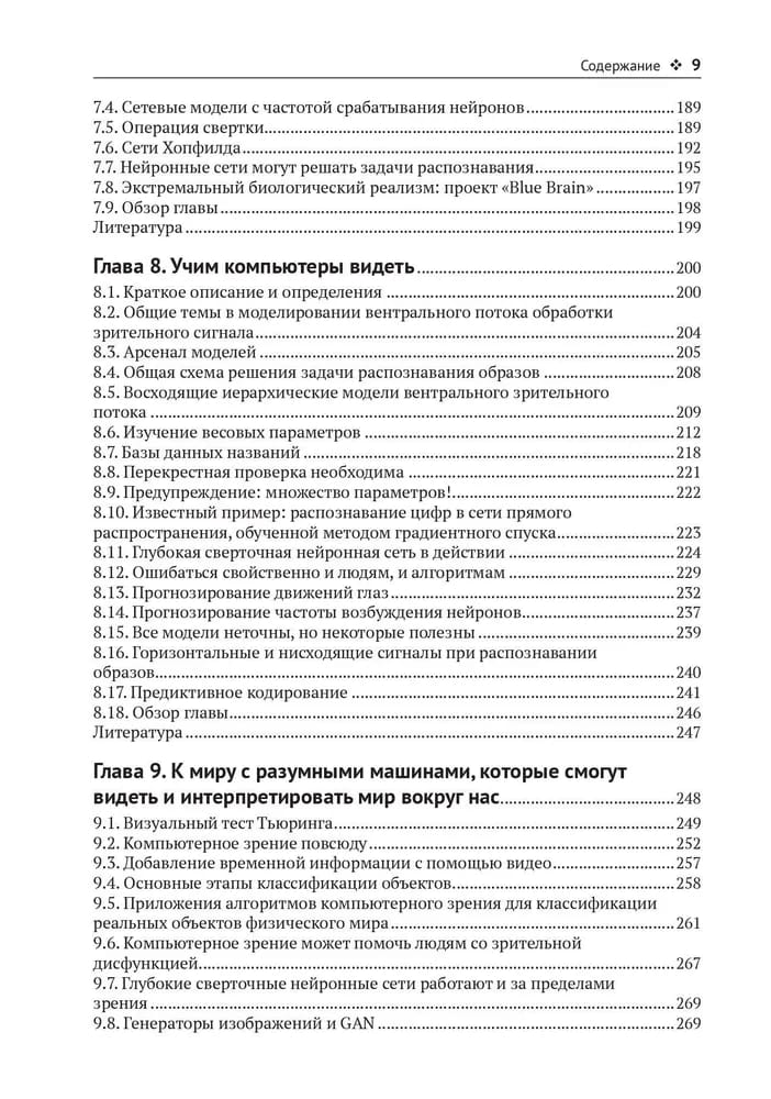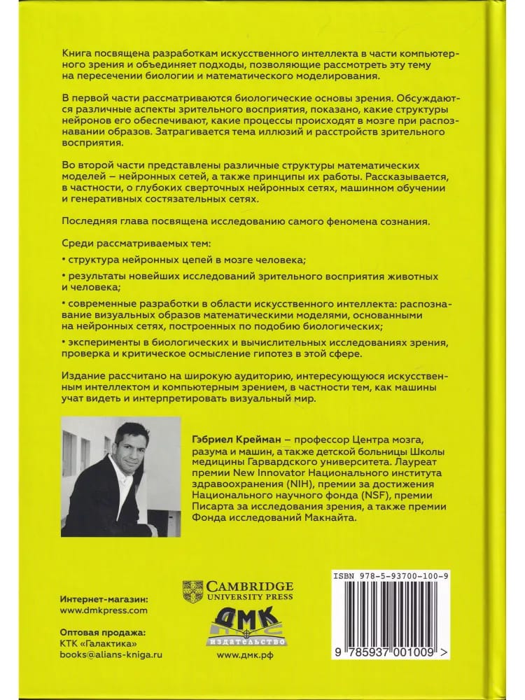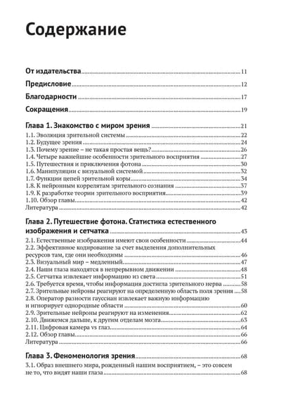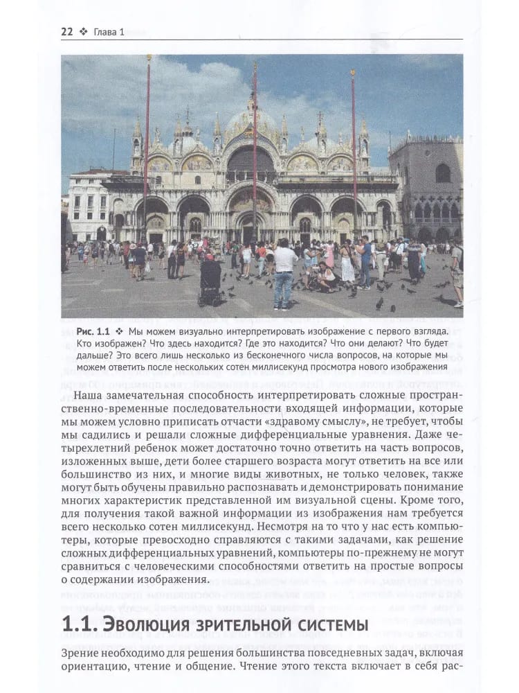 В первой части книги рассматриваются биологические основы зрения: читатель знакомится с различными аспектами зрительного восприятия и узнает, какие структуры нейронов его обеспечивают, какие процессы происходят в мозге при распознавании образов. Во второй части представлены различные структуры математических моделей – нейронных сетей, и принципы их работы. Затрагиваются, в частности, глубокие сверточные нейронные сети, машинное обучение и генеративные состязательные сети. Последняя глава посвящена исследованию самого феномена сознания. Издание рассчитано на широкую аудиторию, интересующуюся искусственным интеллектом и компьютерным зрением, в частности тем, как машины учат видеть и интерпретировать визуальный мир.