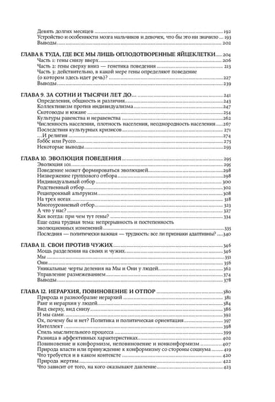 В книге автор поэтапно — можно сказать, в хронологическом разрезе — и очень подробно рассматривает огромное количество факторов, влияющих на наше поведение. Как работает наш мозг? За что отвечает миндалина, а за что нам стоит благодарить лобную кору? Что «ненавидит» островок? Почему у лондонских таксистов увеличен гиппокамп? Как связаны длины указательного и безымянного пальцев и количество внутриутробного тестостерона? Чем с точки зрения нейробиологии подростки отличаются от детей и взрослых? Бывают ли «чистые» альтруисты? В чем разница между прощением и примирением? Существует ли свобода воли? Как сложные социальные связи влияют на наше поведение и принятие решений? И это лишь малая часть вопросов, рассматриваемых в масштабной работе известного ученого.