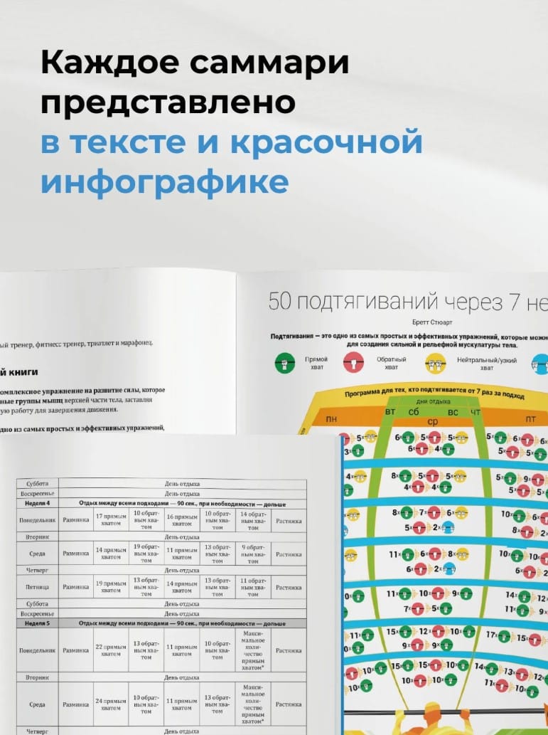 Как же быть? Двигаться нужно, времени на чтение нет, тренеры дороги, но подходить к тренировкам хочется грамотно и без травм… Мы знаем эту дилемму, искали и нашли ей решение! Собрали все лучшие книги по спорту, прочли их за вас, отжали, сохранив самую суть, сложили в один сборник из 12 бестселлеров, и к каждому нарисовали инфографики для наглядной демонстрации и мотивации.