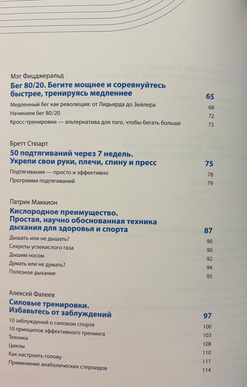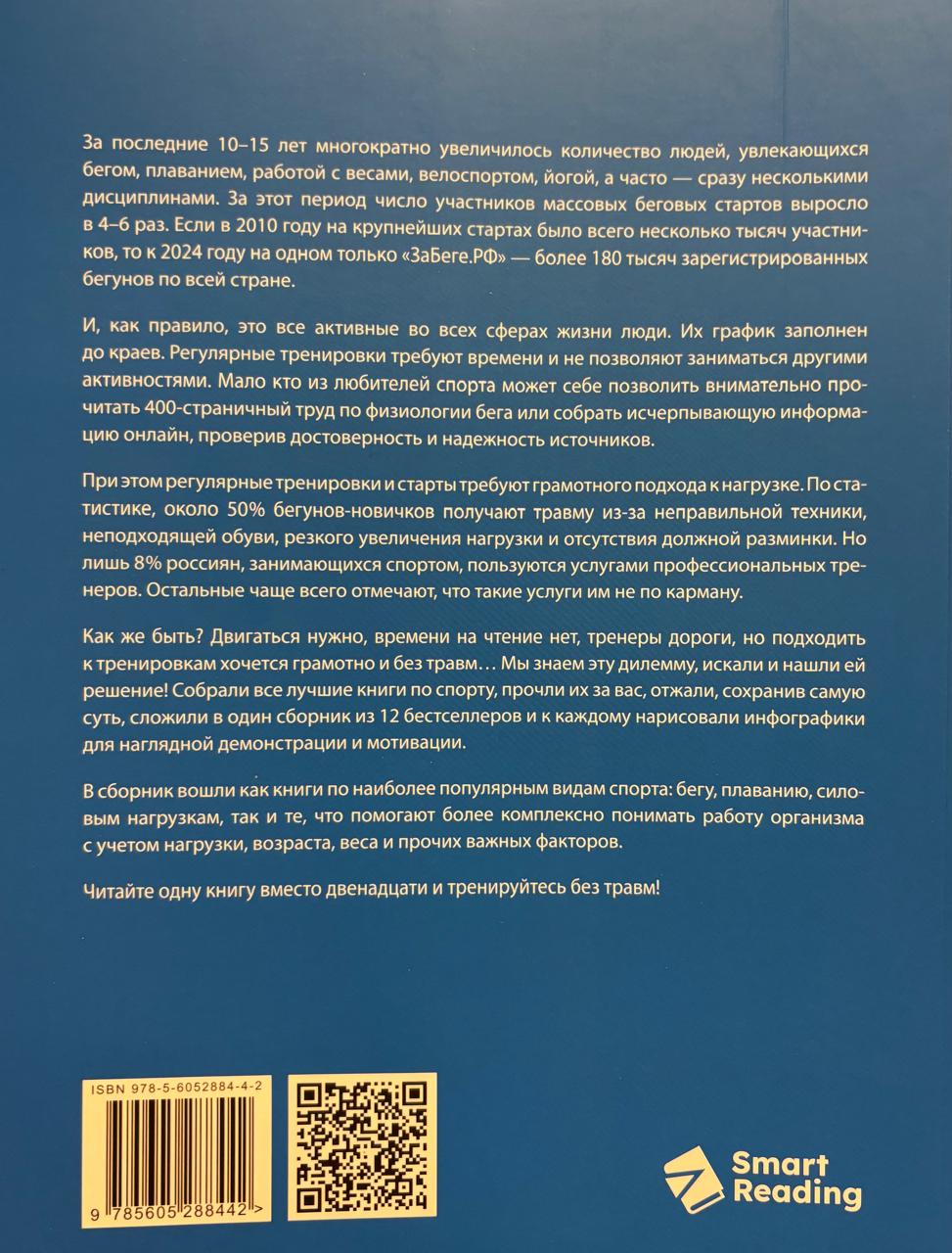 В сборник вошли как книги по наиболее популярным видам спорта: бегу, плаванию, силовым нагрузкам, так и те, что помогают более комплексно понимать работу организма с учетом нагрузки, возраста, веса и прочих важных факторов.