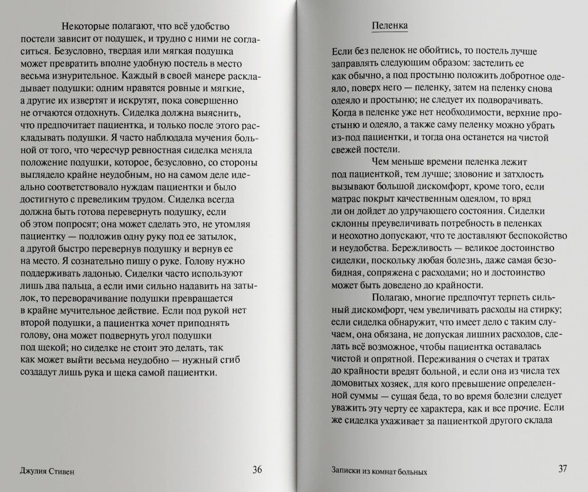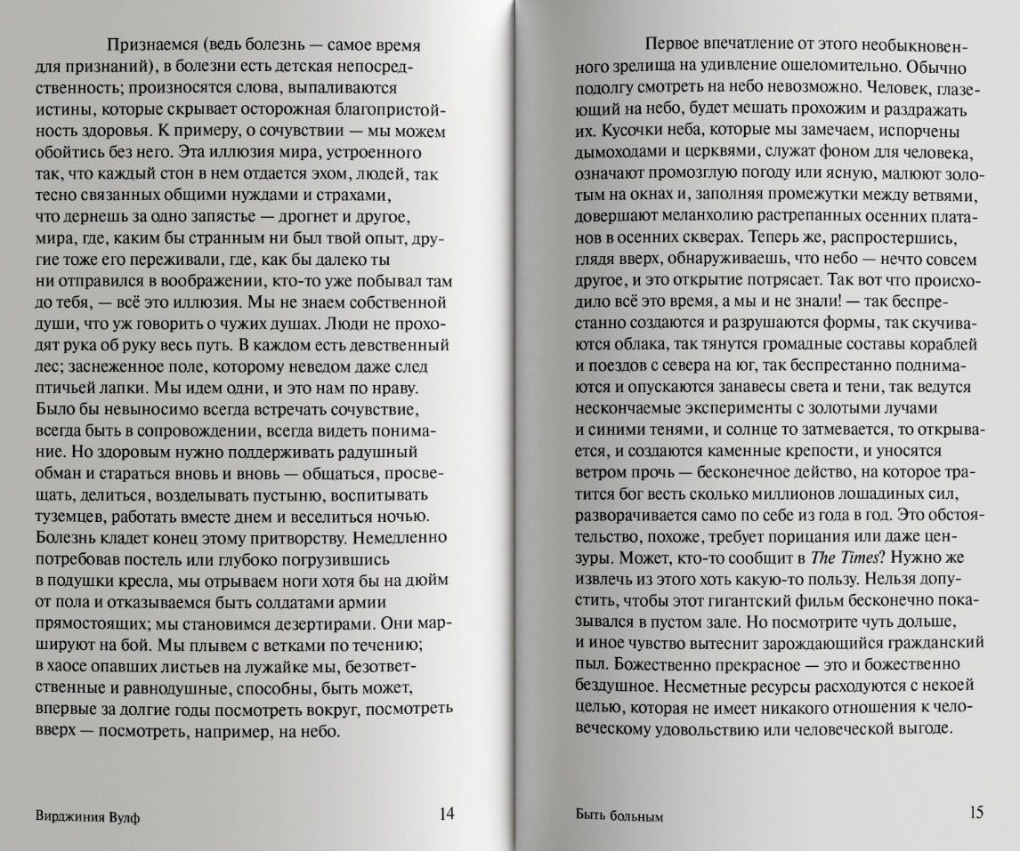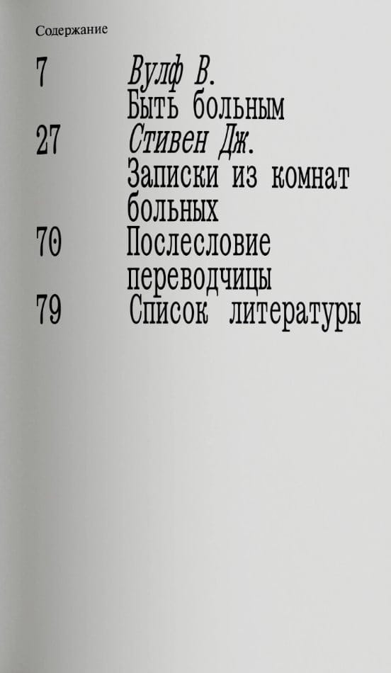 В эссе «Быть больным» (1926) Вирджиния Вулф затрагивает вопрос: почему болезням — повседневному и неотъемлемому явлению человеческой жизни — посвящено непростительно мало текстов? По мнению писательницы, которая сама немало страдала от телесных недугов, вынужденно оторванному от привычного мира и прикованному к кровати человеку открывается совершенно иное видение вещей. Для Вулф болезнь — это трамплин, позволяющий вырваться за пределы расхожих истин, «радушного обмана» общества и начать воспринимать мир вне норм, как бы изнутри себя. В своем взгляде на болезнь она расходится с матерью Джулией Стивен, опытной сиделкой и автором практического руководства «Записки из комнат больных» (1883). Оба текста впервые публикуются на русском языке и знакомят читателя с двумя разными способами письма о болезни от двух непохожих друг на друга женщин.