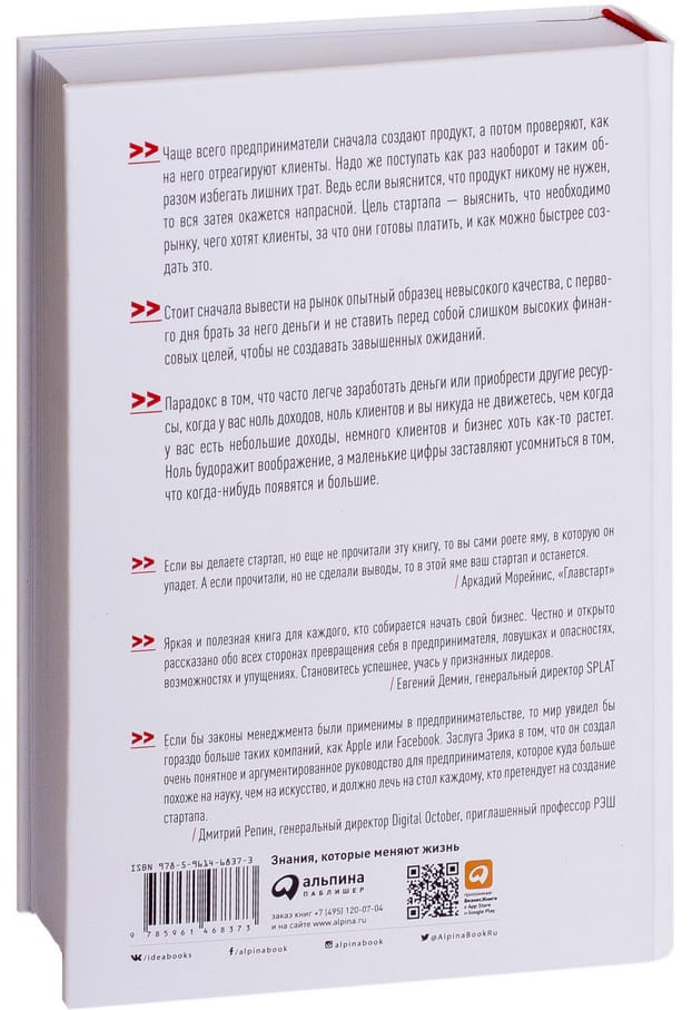 Предпринимательство — это особый вид менеджмента. Основная идея метода экономичного стартапа, разработанного автором, заключается в быстром тестировании идей новых продуктов на реальных потребителях и постоянной корректировке бизнес-модели с тем, чтобы начинать масштабные вложения только тогда, когда идея подтверждена фактами.