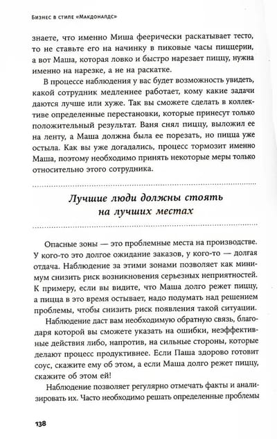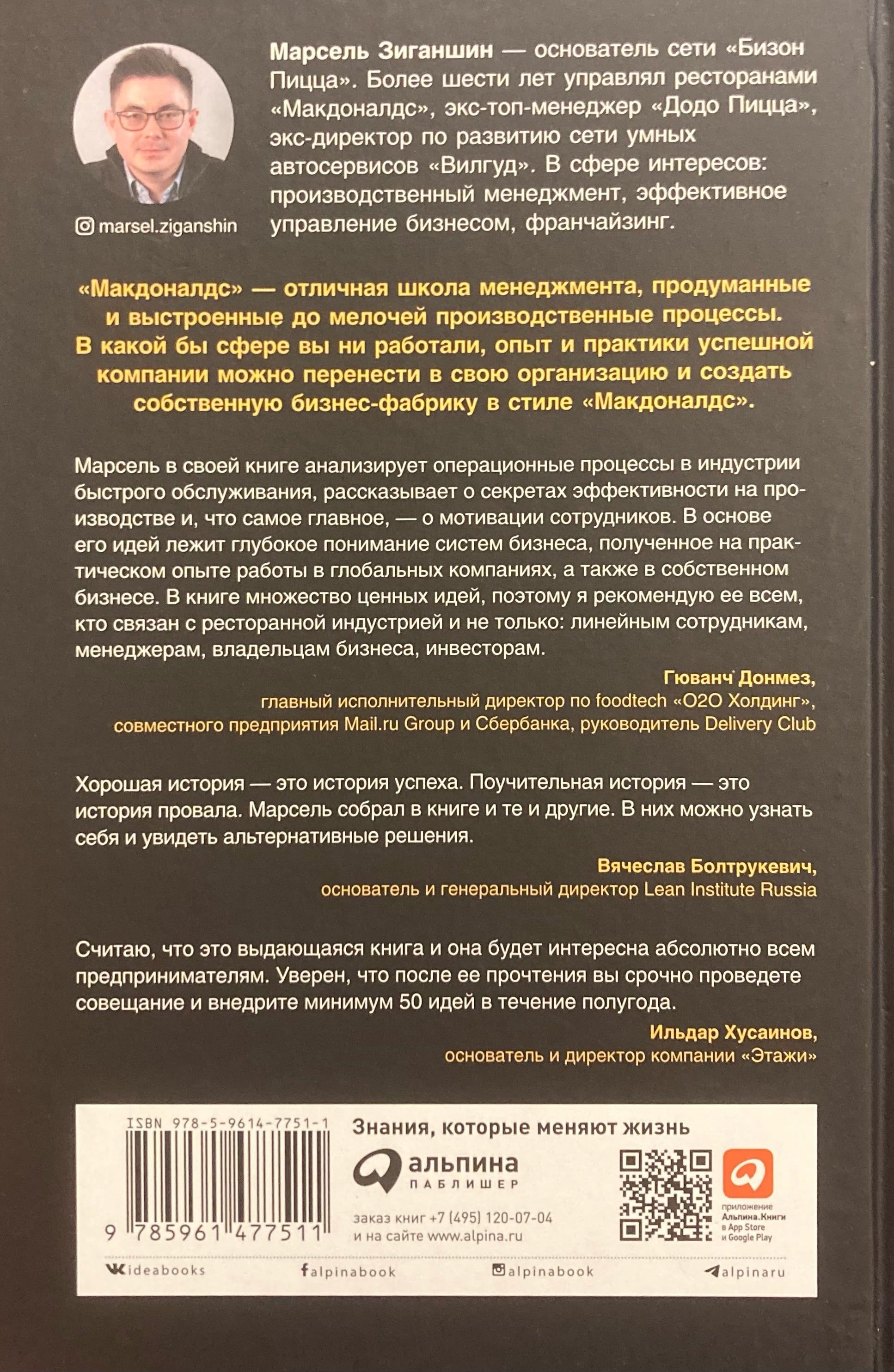 «Макдоналдс» — отличная школа менеджмента, продуманные и выстроенные до мелочей производственные процессы. Благодаря четким стандартам компания добивается их идеальной синхронизации. Можно ли перенести этот опыт и практики в свою компанию и создать бизнес-фабрику в стиле «Макдоналдс»? Опираясь на многолетний управленческий опыт работы в «Макдоналдс», «Додо Пицце», «Вилгуд», предприниматель Марсель Зиганшин утверждает: в какой бы сфере вы ни работали, свой «Макдоналдс» можно построить везде. Его книга состоит из трех основных частей: «Команда», «Эффективность и управление» и «Клиент». Именно эти три составляющие необходимо держать под контролем, чтобы бизнес работал без сбоев, как слаженный механизм, и автор подробно на примерах из практики рассказывает, как это сделать.