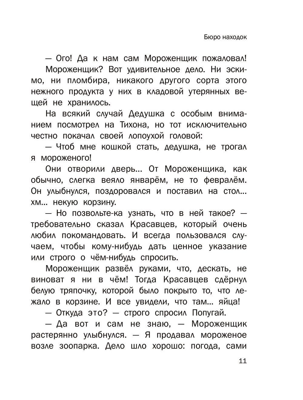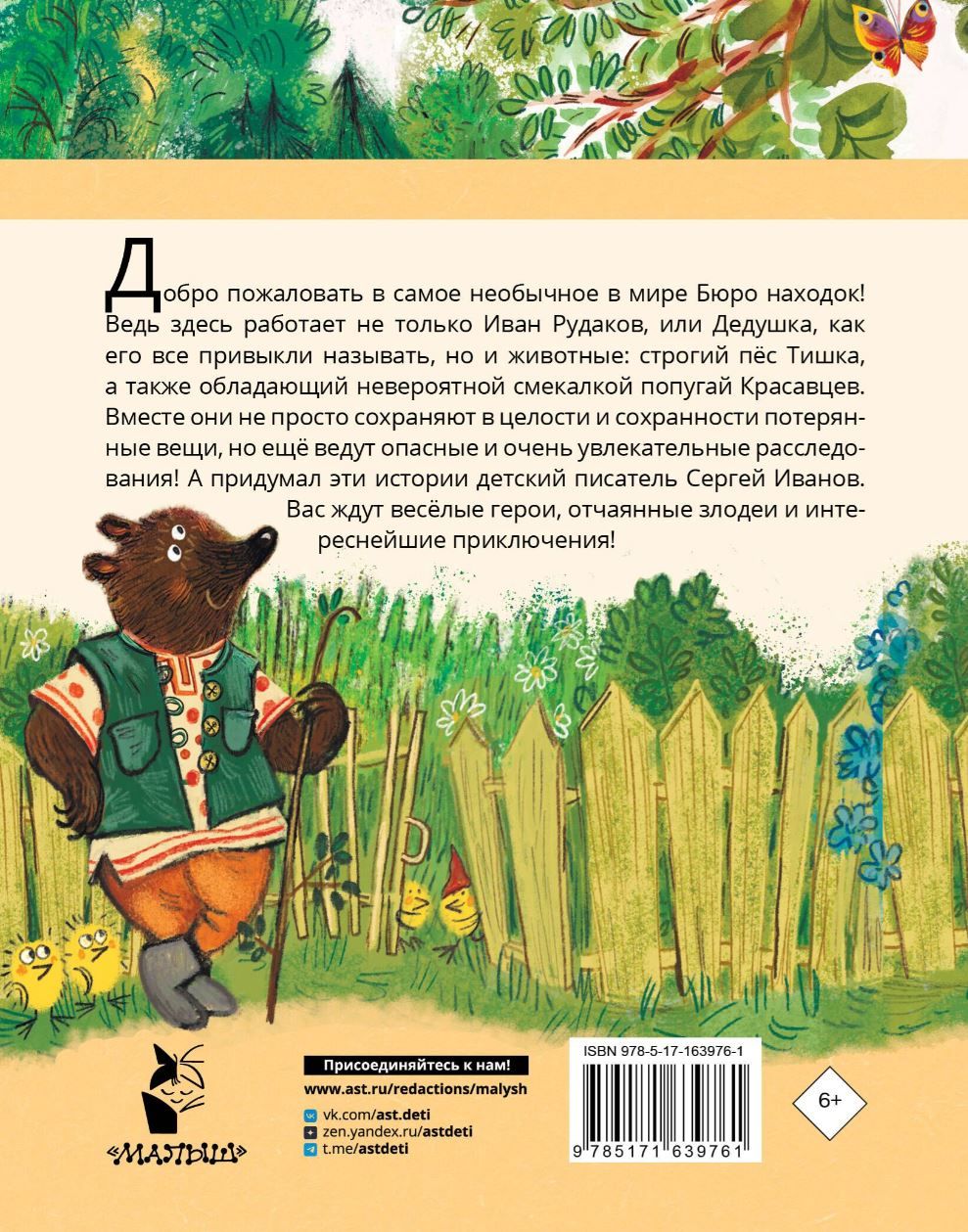 Сергей Иванов (1941–1999) — детский писатель, педагог, мастер школьного романа, автор сценариев знаменитых мультфильмов «‎Падал прошлогодний снег»‎, «‎Маловато будет»‎ и «‎Бюро находок»‎. В эту книгу вошли две сказочные повести Сергея Иванова — «‎Бюро находок»‎ и «‎Бюро находок-2»‎. Главные герои этих произведений — Дедушка, Попугай Красавцев и пёс Тишка, которых многие родители, а также бабушки и дедушки знают по циклу мультфильмов. Пришло время и современным маленьким читателям познакомиться с работниками Бюро находок и погрузиться в увлекательные приключения! Вы узнаете, как Попугай Красавцев приобрёл второе, очень необычное имя — Папа-Гай, и кто проник ночью в Бюро, украв из него важные находки, а также многие другие интересные истории.