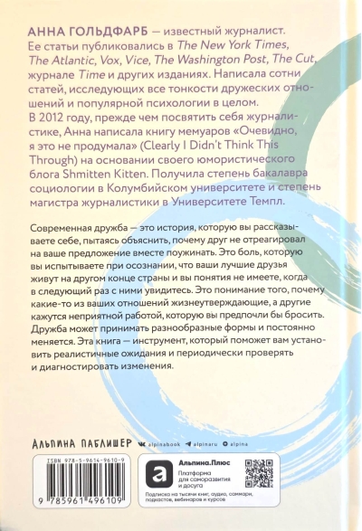 Журналистка Анна Гольдфарб лично столкнулась с этими сложностями: за 20 лет она сменила три крупных города и множество друзей. Опираясь на полученный опыт и результаты исследований, автор разработала методику для поддержания здоровой дружбы — схему трех «П»: притяжение, преданность и понимание. Изучив ее книгу, вы узнаете, как стать достаточно хорошим другом, определите типы и роли своих друзей, научитесь правильно давать советы, выражать признательность и поддержку и поймете, какие ценности для вас важны в дружеских отношениях.