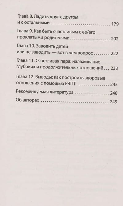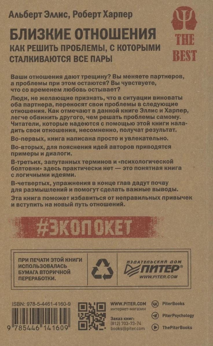 Ваши отношения дают трещину? Вы меняете партнеров, а проблемы при этом остаются? Вы чувствуете, что со временем любовь остывает? Люди, не желающие признать, что в ситуации виноваты оба партнера, переносят свои проблемы в следующие отношения. Как отмечают в данной книге Эллис и Харпер, легче обвинить другого, чем решать проблемы самому. Читатели, которые надеются с помощью этой книги наладить свои отношения, несомненно, получат результат. Во-первых, книга написана просто и увлекательно. Во-вторых, для пояснения идей авторов приводятся примеры и диалоги. В-третьих, запутанных терминов и «психологической болтовни» здесь практически нет — это понятная книга с логичными идеями. В-четвертых, упражнения в конце глав дадут почву для размышлений и помогут сделать важные выводы. Эта книга поможет избавиться от неправильных привычек и вступить на новый путь отношений.