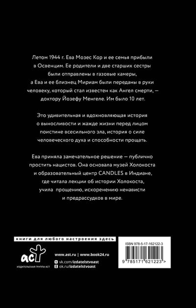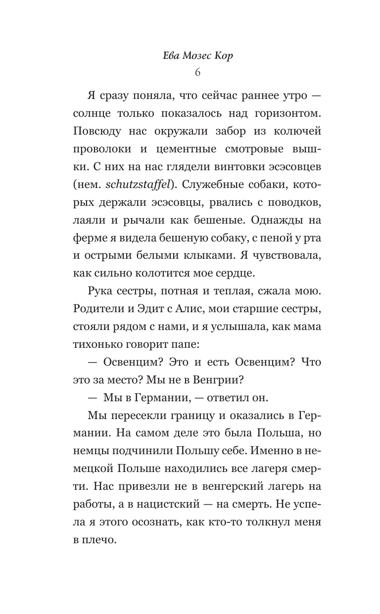 Летом 1944 г. Ева Мозес Кор и ее семья прибыли в Освенцим. Ее родители и две старших сестры были отправлены в газовые камеры, а Ева и ее близнец Мириам были переданы в руки человеку, который стал известен как Ангел Смерти, — доктору Йозефу Менгеле. Им было 10 лет.