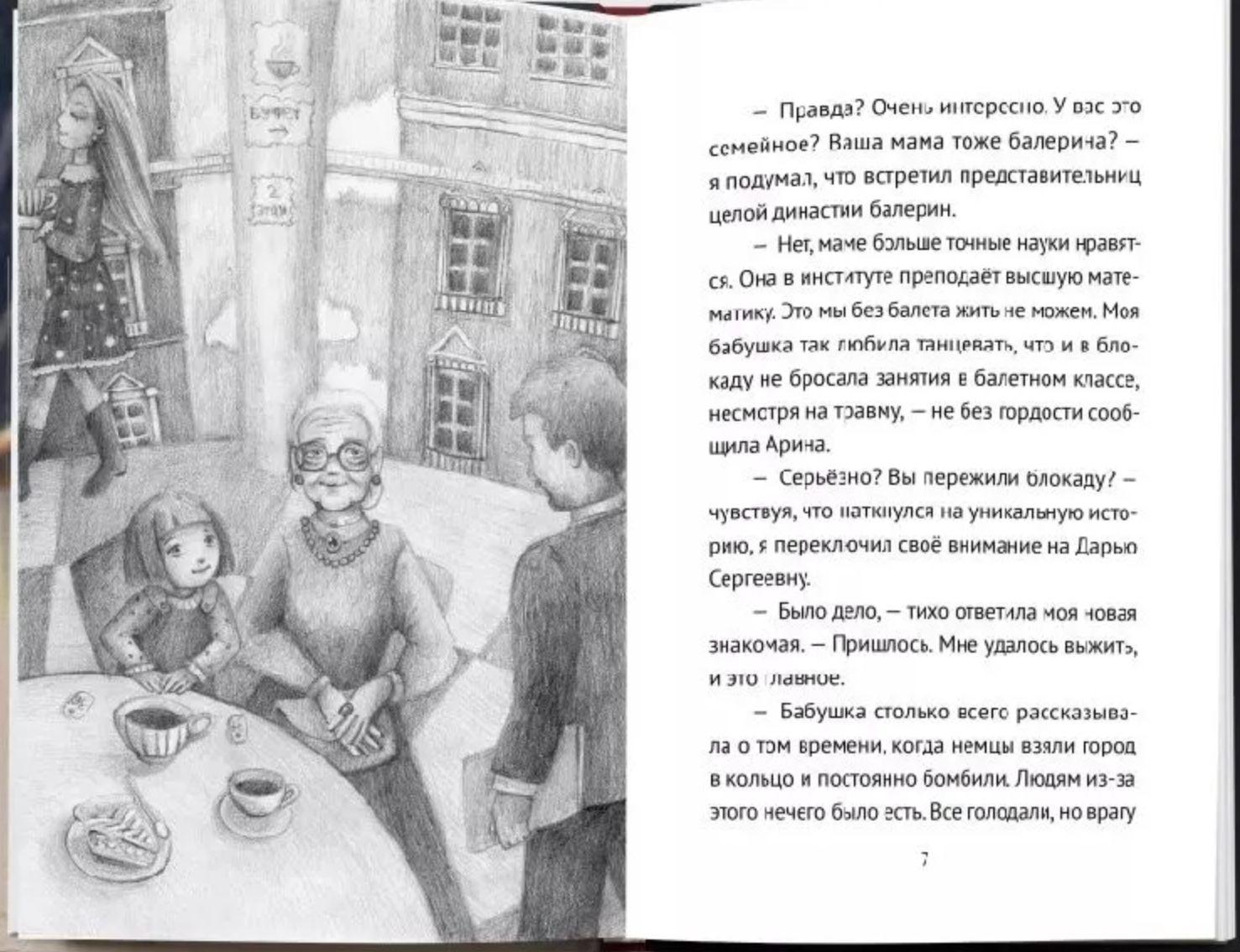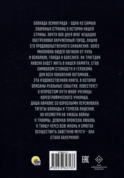 Эта книга является символом их стойкости и героизма, а также напоминает о том, что историю нужно помнить, чтобы не повторить ошибки прошлого. Особенностью этой книги является то, что она написана в жанре художественной литературы, но основана на реальных событиях. Она рассказывает историю юной ученицы хореографического училища по имени Даша. Вместе с взрослыми она переживает тяготы блокады и страдает от лишений, но несмотря на все ужасы войны и травмы, она сохраняет свою любовь к танцу. Эта страсть сопровождает ее через всю жизнь и помогает ей осуществить заветную мечту - стать балериной.