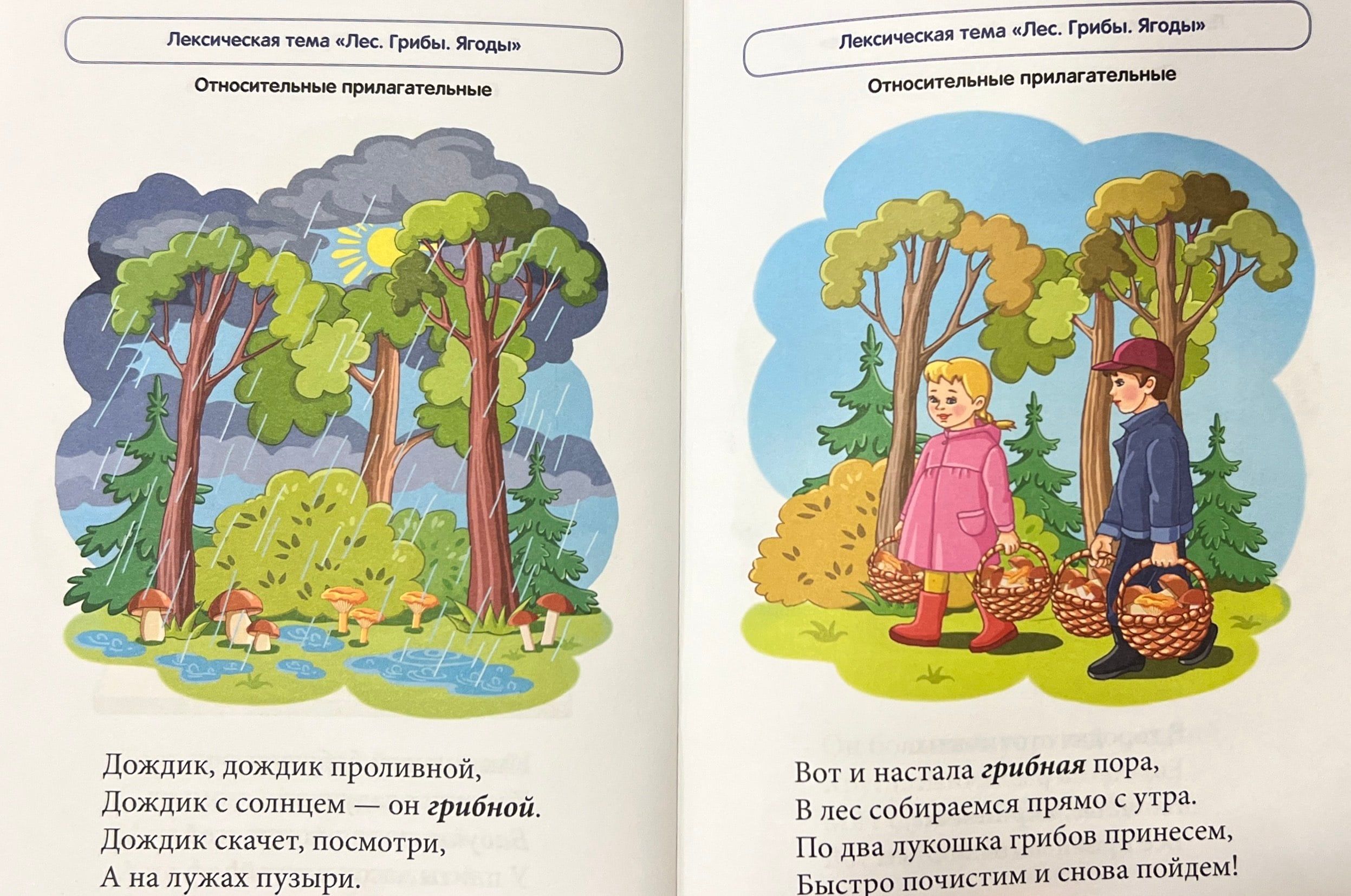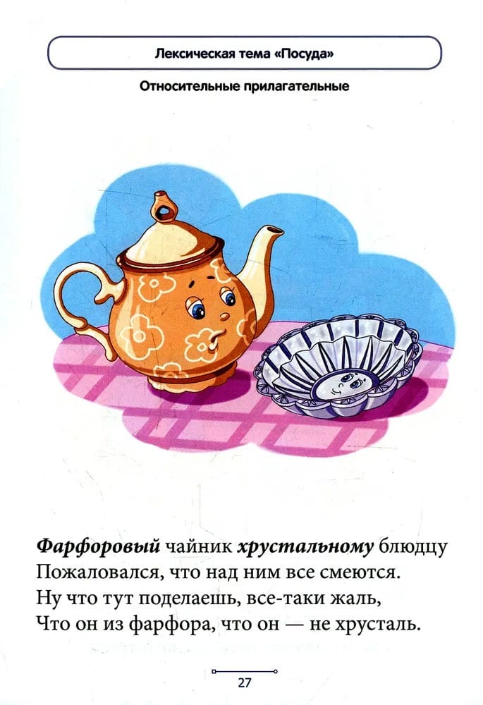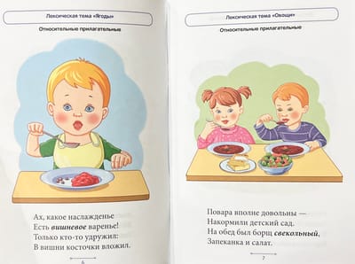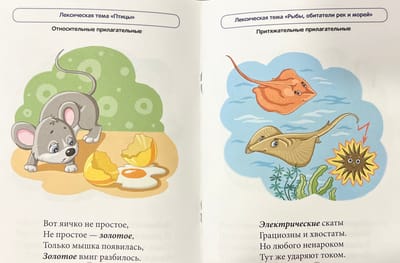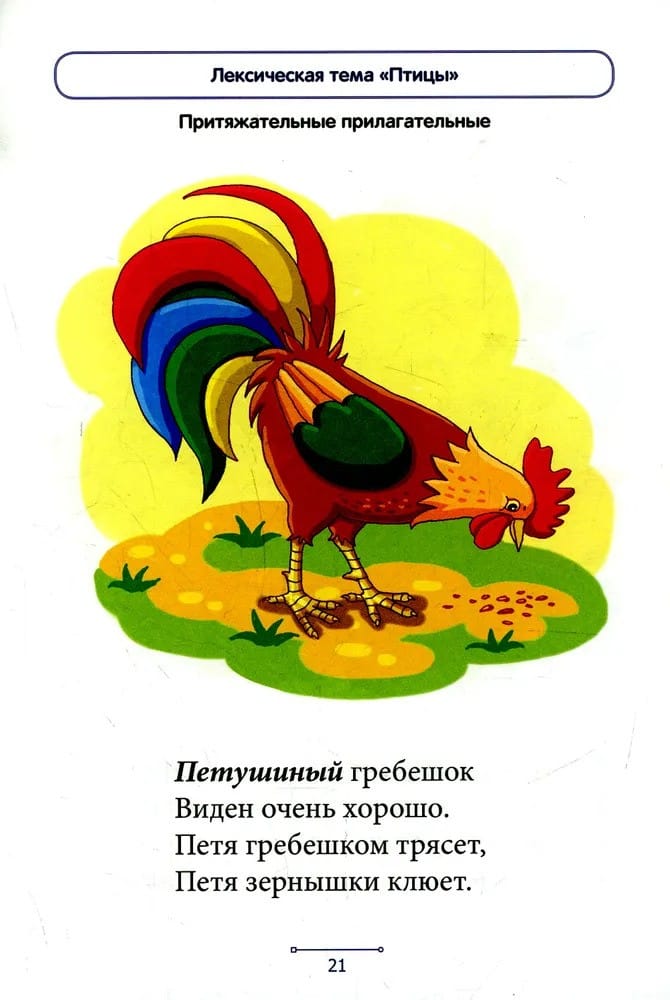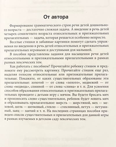 В блокноте представлены веселые стишки, которые помогут дошкольникам усвоить способы образования относительных и притяжательных прилагательных, а значит, сделать речь образной и богатой. Данный способ словообразования отрабатывается при изучении нескольких лексических тем, названия которых указаны в верхней части каждой страницы. Приобретенные знания закрепляются в игровых заданиях.