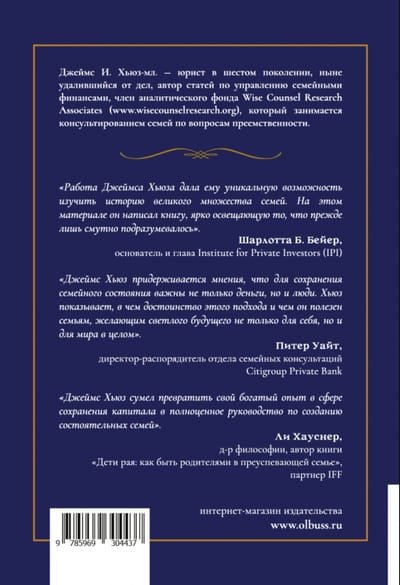Джеймс Хьюз излагает принципы управления семьей и семейным капиталом и дает практические советы. Он предлагает оригинальную стратегию сохранения и приумножения человеческих, интеллектуальных и финансовых активов семьи, используя в своих рекомендациях элементы психологии, антропологии, политической истории, философии, экономической теории и права. Идеи Хьюза взяты на вооружение многими семьями, консультантами, учеными и практиками — и все они подтвердили ценность разработанных автором принципов и методов.