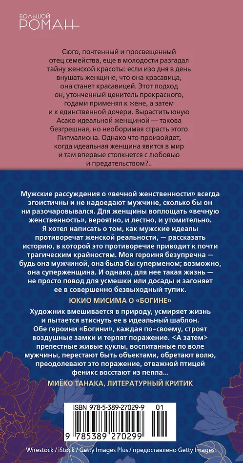 Юкио Мисима (1925–1970) — звезда литературы XX века, самый читаемый в мире японский автор, обладатель блистательного таланта, прославившийся как своими работами широчайшего диапазона и разнообразия жанров (романы, пьесы, рассказы, эссе), так и ошеломительной биографией (одержимость бодибилдингом, крайне правые политические взгляды, харакири после неудачной попытки монархического переворота). Его «Богиня» — тонкая, отчасти сатирическая аллегория творчества (считается, что Мисима полемизирует здесь с эстетом Дзюнъитиро Танидзаки и трагической фигурой японской поэзии Осаму Дадзаем) и пронзительная история о реальных людях, которые во имя любви к прекрасному пытаются лепить красоту из живого материала и в результате обречены лицом к лицу столкнуться с богами.