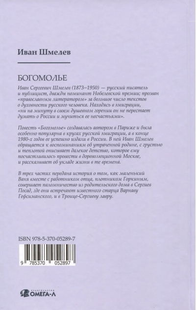 Повесть «Богомолье» создавалась автором в Париже и была особенно популярна в кругах русской эмиграции, а в конце 1980-х годов её успешно издали в России. В ней Иван Шмелёв обращается к воспоминаниям об утраченной родине, с грустью и теплотой описывает далёкое детство, которое ему посчастливилось провести в дореволюционной Москве, и рассказывает об укладе жизни в те времена.