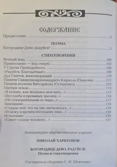 Нынешний сборник «Богородице Дево, радуйся!» посвящён жизни Божией Матери на земле. В 2011 году решением Учёного совета факультета православной культуры Военной академии ракетных войск стратегического назначения имени Петра Великого Николаю Харитоновичу было присвоено звание почётного профессора факультета православной культуры.