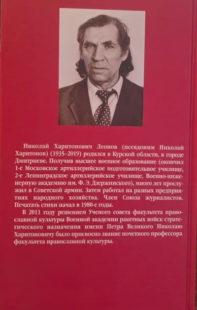 Николай Харитонович Леонов (псевдоним Николай Харитонов) родился 20 января 1935 года в Курской области, в городе Дмитриеве. Рано потерял родителей. Воспитывался вместе со старшим братом в Скри- поровском детском доме в городе Малоярославце Калужской области. Окончив первый курс Калужского железнодорожного техникума, поступил в Первое Московское артиллерийское подготовительное училище, затем окончил Второе Ленинградское артиллерийское училище и Военно-инженерную академию имени Ф. Э. Дзержинского. В 1965 году демобилизован из рядов Советской армии по состоянию здоровья. Работал на разных предприятиях народного хозяйства. Член Союза журналистов. Печатать стихи начал в 1980-е годы. Издал ряд сборников: «Избранное» (1999), «Духовные размышления» (2007), «Дивен Бог во святых Своих» (2011), «Я хочу спастись» (2014). Вся поэзия Николая Харитонова посвящена духовной тематике. Им опубликованы поэмы: «Александр Невский», «Искупление», «Исцеление Тиверия», «Предтеча», «Бог вчера и сегодня и вовеки Тот же», «Пастырь», «Я хочу спастись», «Невеста Христова прекрасная», «Перстень Христа», «Первый шаг в Небо (Монах)».