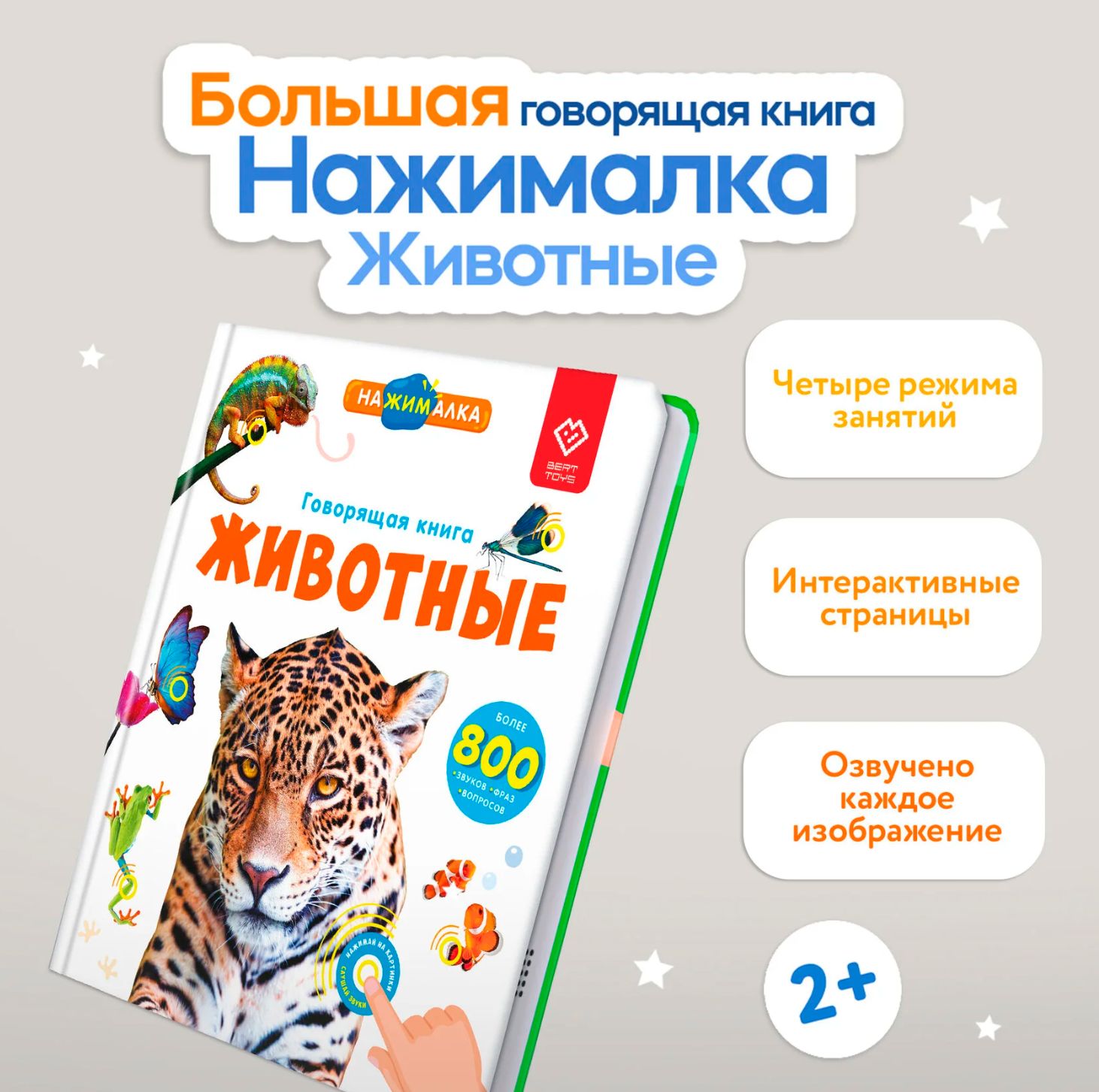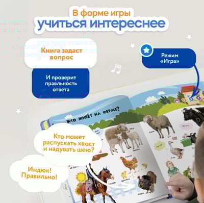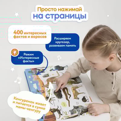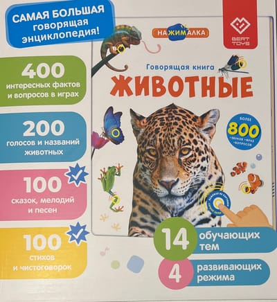 Говорящая интерактивная книга «Животные» — теперь в увеличенном формате! Нажимай пальчиком на страницы и картинки оживут! 28 страницы с реальными фотографиями. Более 800 фраз, заданий, вопросов. Четыре режима для игр и развития.