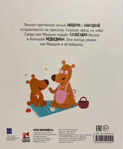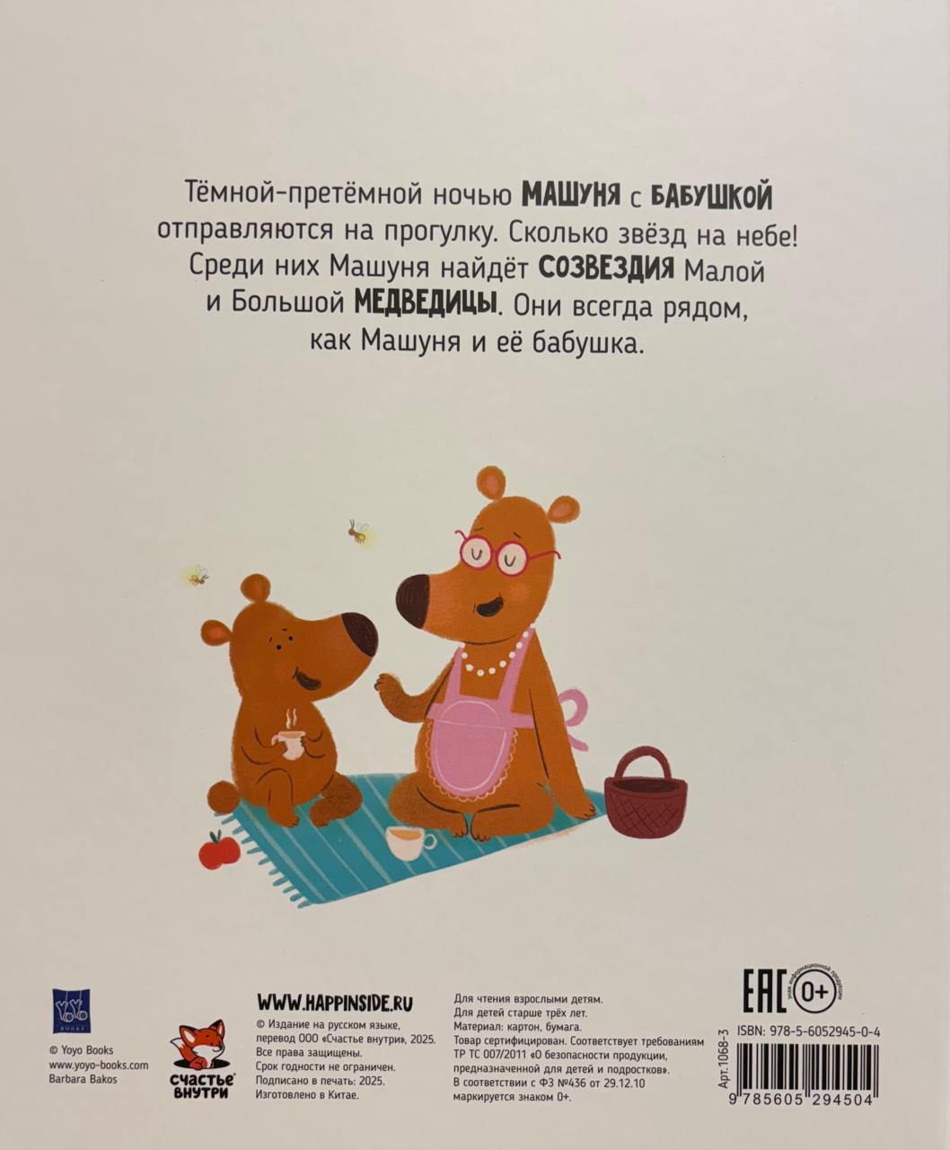 Тёмной-претёмной ночью Машуня с бабушкой отправляются на прогулку. Сколько звёзд на небе! Среди них Машуня найдет созвездия Большой и Малой медведицы. Они всегда рядом, как Машуня и её бабушка. Эта увлекательная история в прозе для детей от 3 лет, для дошкольников и младших школьников, идеально подходит для совместного чтения перед сном.