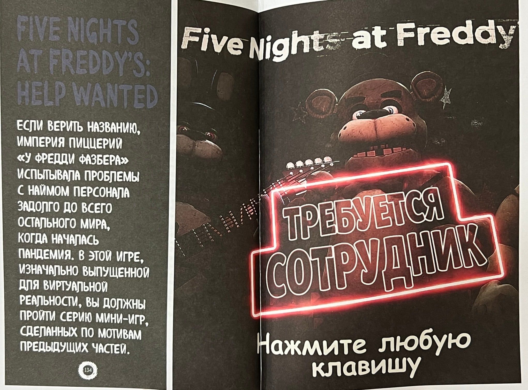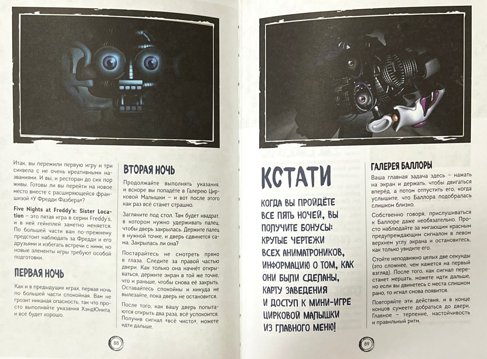 Внутри в стиле ФНАФ — мрачно, много черного цвета, местами пугающе! В этой книге: прохождение, особенности аниматроников, подсказки о том, как рисовать персонажей, как написать собственную страшную историю, примеры хоррор-игр, которые могут быть интересны геймерам. Чем отличается от других гайдов по ФНАФ: подойдет для начинающего игрока, фаната компьютерных игр и аниматроников. Всё подробно, простым языком, персонажи крупно. Отличная новинка к коллекции книг серии Five Nights at Freddy’s!