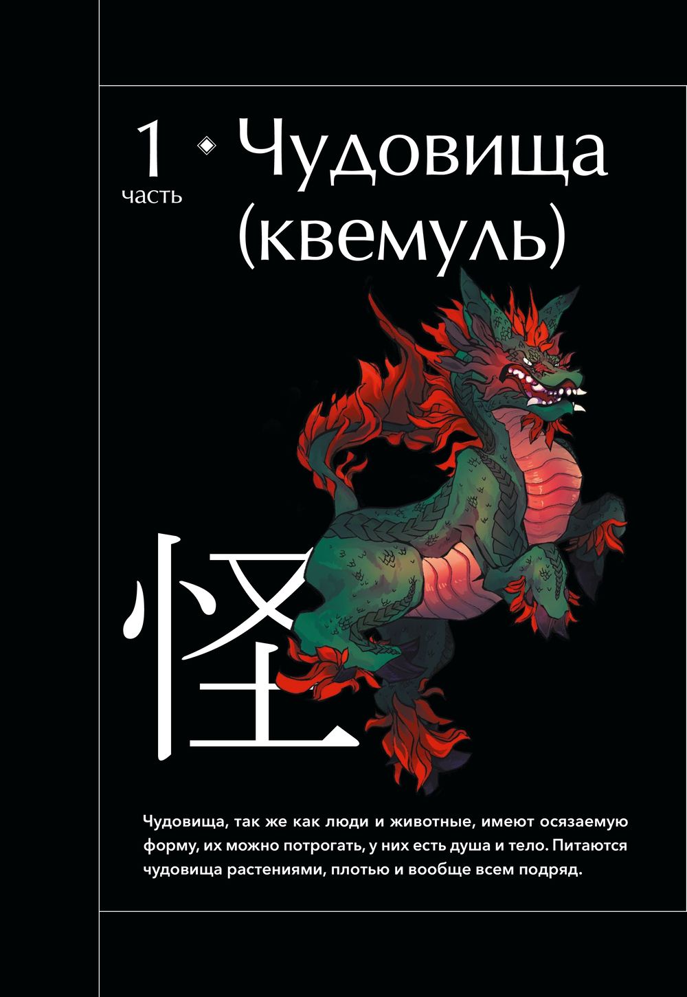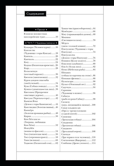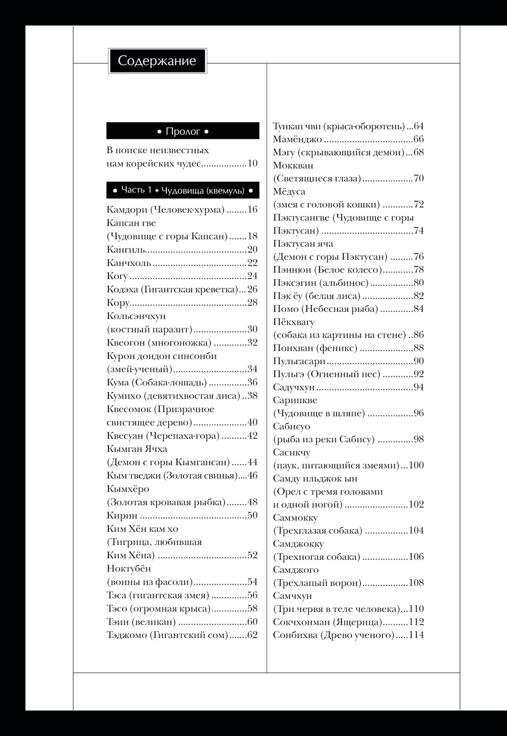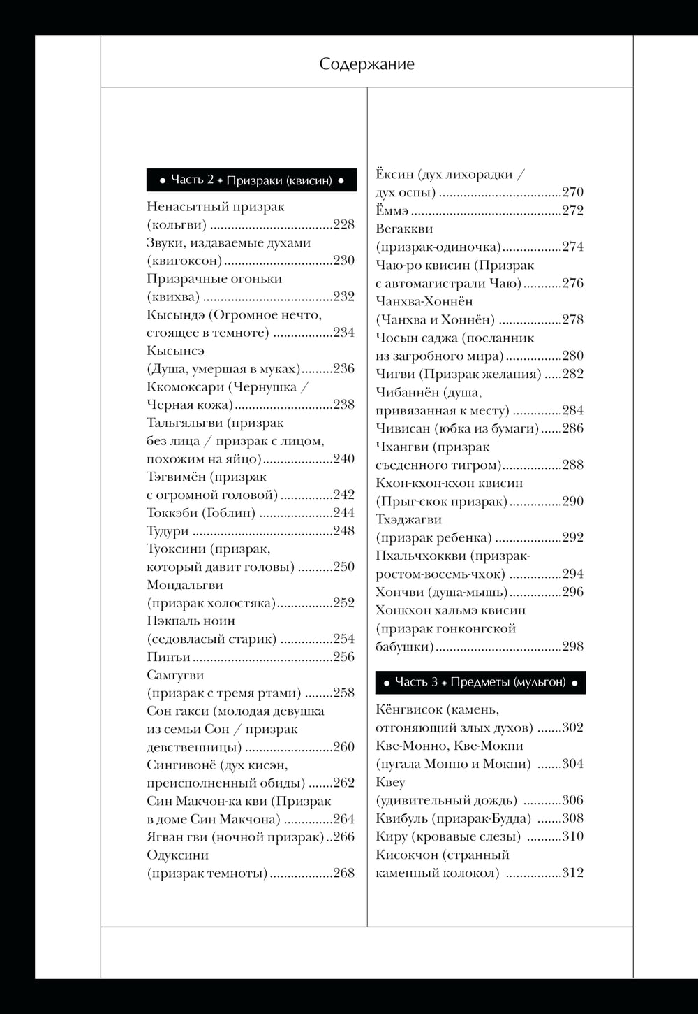 Книга состоит из 4-х частей. Первая знакомит с чудовищами (квемуль) ― осязаемыми звероподобными или человекоподобными существами. Вторая повествует о призраках (квисин). Третья — о предметах, которые обладают уникальными способностями (мульгон). Четвертая посвящена духам (син), которые с давних пор сосуществовали с людьми. Духи, так же как и чудовища, делятся на несколько типов в соответствии с их качествами. Каждый раздел содержит самобытные иллюстрации с изображением духов, монстров и артефактов. А цитаты из древних корейских трактатов и городские легенды помогут поверить в то, что все это реальность.