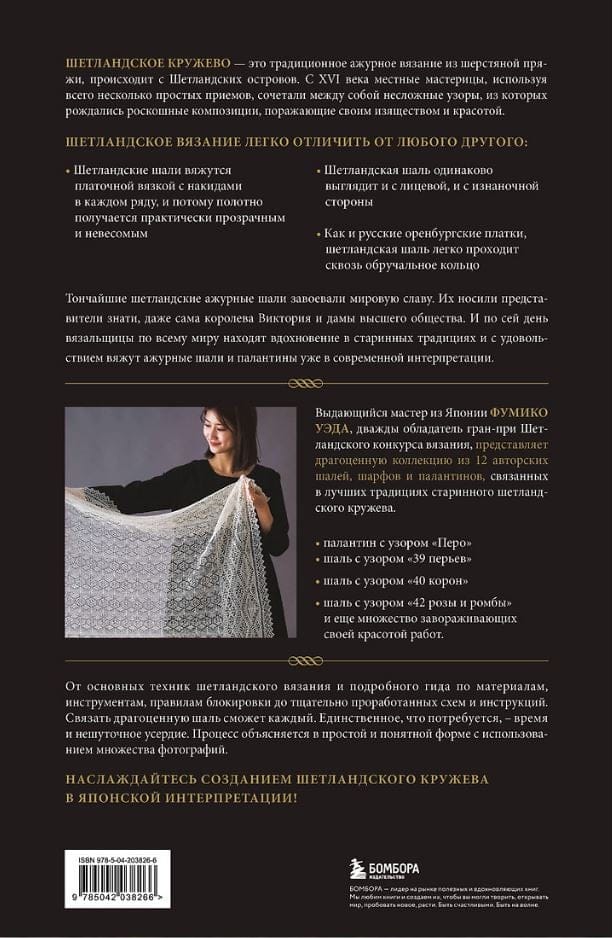 Выдающийся мастер из Японии Фумико Уэда представляет драгоценную коллекцию из 12 авторских шалей, шарфов и палантинов, связанных в лучших традициях старинного шетландского кружева. А еще дает исчерпывающую информацию, чтобы связать такую красоту смог каждый.