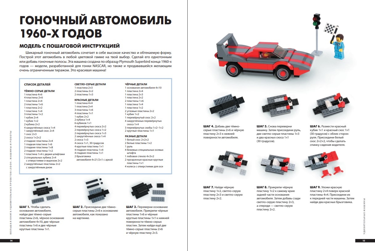 Приготовься создавать удивительные машины, городские сценки, и даже произведения искусства! Эта книга поможет тебе использовать своё воображение на полную мощность! В ней ты найдёшь более 30 пошаговых инструкций по сбору разнообразных фигур и сценок, но, включив фантазию, ты сможешь сделать гораздо больше! Используй схемы из книги как отправную точку для сооружения собственных уникальных моделей. Учись новым техникам конструирования, создавай свой мир LEGO — и для этого у тебя наверняка есть все детали!