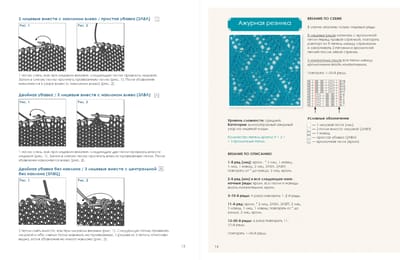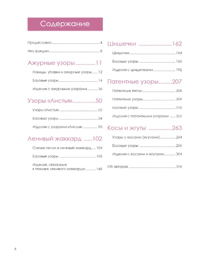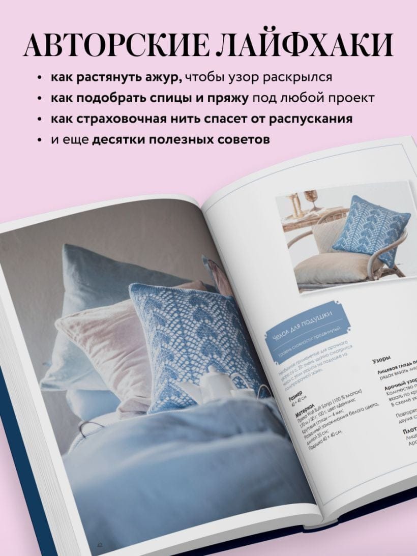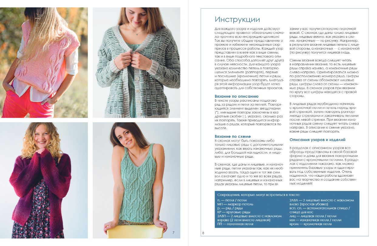 Открыв книгу на любом узоре — например, «Ажурные листья» — вы сразу увидите, как он может выглядеть в разных изделиях. Этот узор может превратиться в изящное болеро, летние носочки, элегантную салфетку или пятнадцать других совершенно разных вещей. И так с каждым из 99 узоров!
