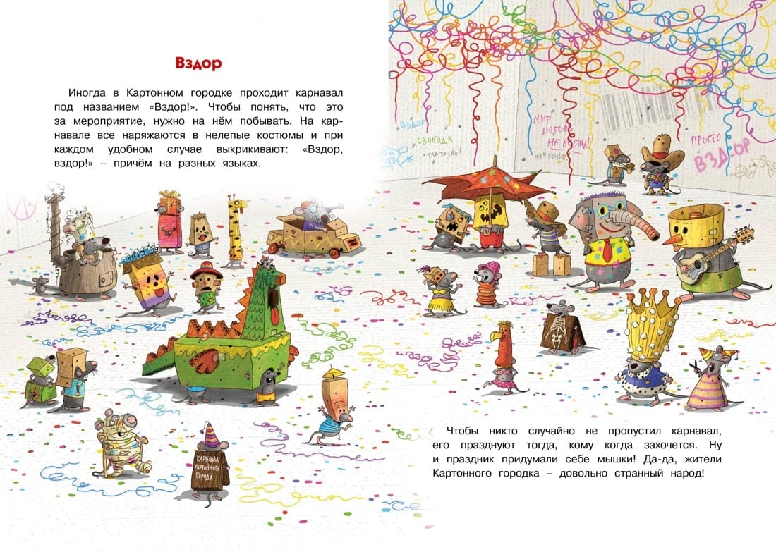 «Сказки Картонного городка» – это весёлые истории о самом удивительном, самом необыкновенном городке на свете. Здесь всё сделано из картона – дома, машины, самолёты, даже корабли и космические ракеты. А живёт-поживает в этом городке забавный мышиный народ, с которым непременно стоит познакомиться! Обитатели Картонного городка не привыкли жить обычной, спокойной жизнью, ведь, как они считают, это ужасно скучно. И вот однажды в городке случилось событие, которое вызвало суматоху, – пропала головка лучшего эмментальского сыра. Неужели среди жителей завёлся подлый воришка? Вся полиция городка бросилась на поиски этого наглеца, который решился на такое неслыханное преступление…