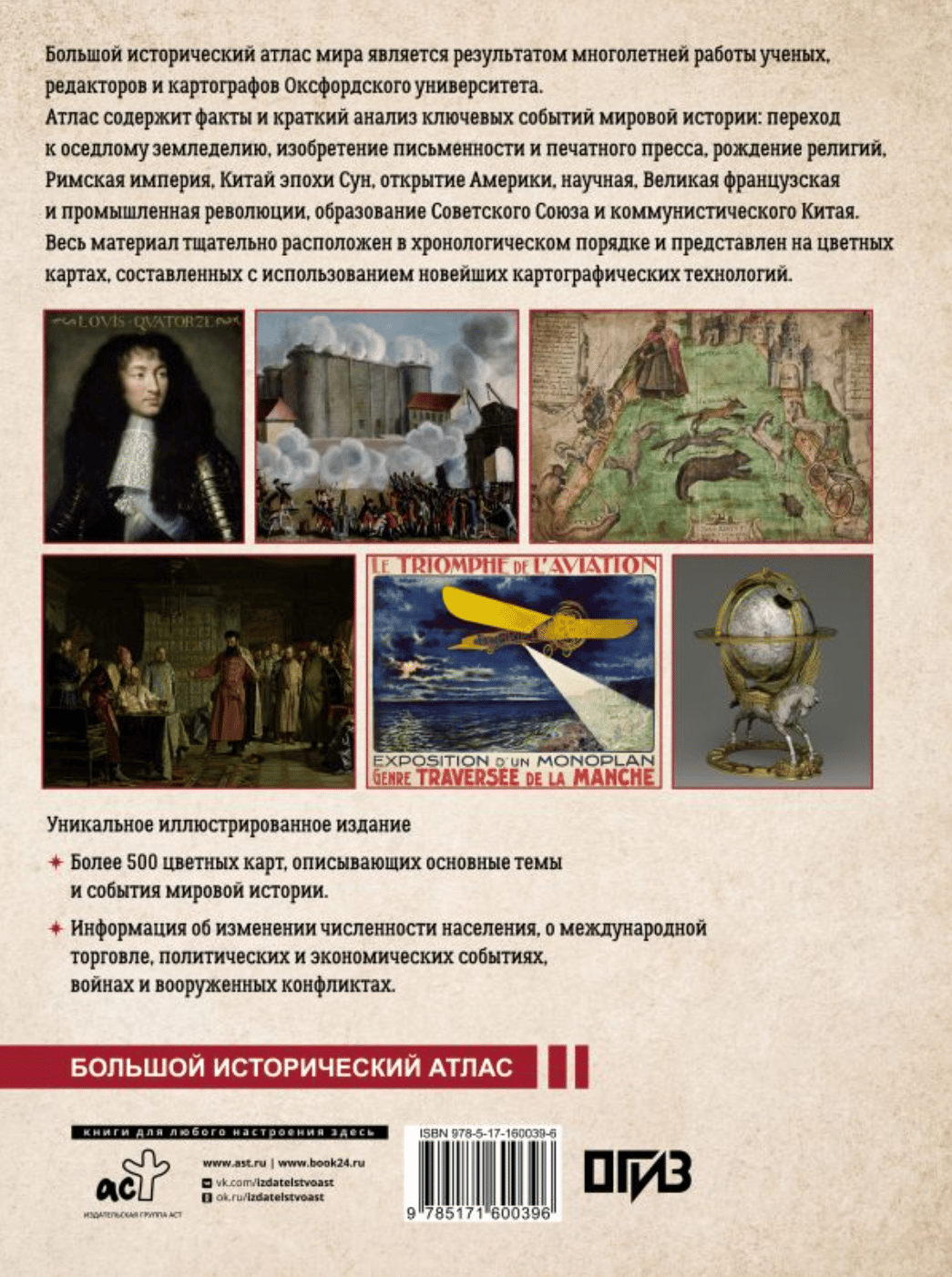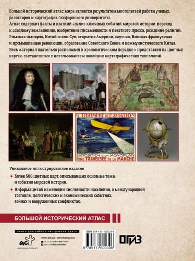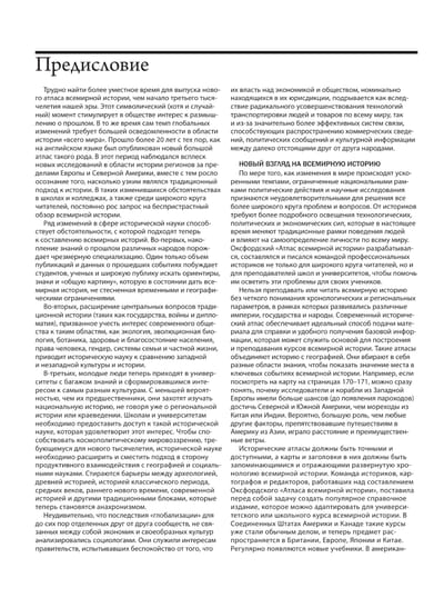 Большой исторический атлас мира является результатом многолетней работы ученых, редакторов и картографов Оксфордского университета. Атлас содержит факты и краткий анализ ключевых событий мировой истории: переход к оседлому земледелию, изобретение письменности и печатного пресса, рождение религий, Римская империя, Китай эпохи Сун, открытие Америки, научная, Великая французская и промышленная революции, образование Советского Союза и коммунистического Китая. Весь материал тщательно расположен в хронологическом порядке и представлен на цветных картах, составленных с использованием новейших картографических технологий. Издание состоит из пяти частей — «Древний мир», «Средневековье», «Мир раннего Нового времени», «Эпоха революций» и «XX век».