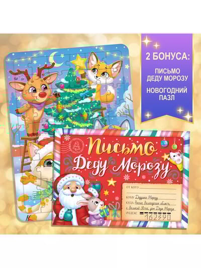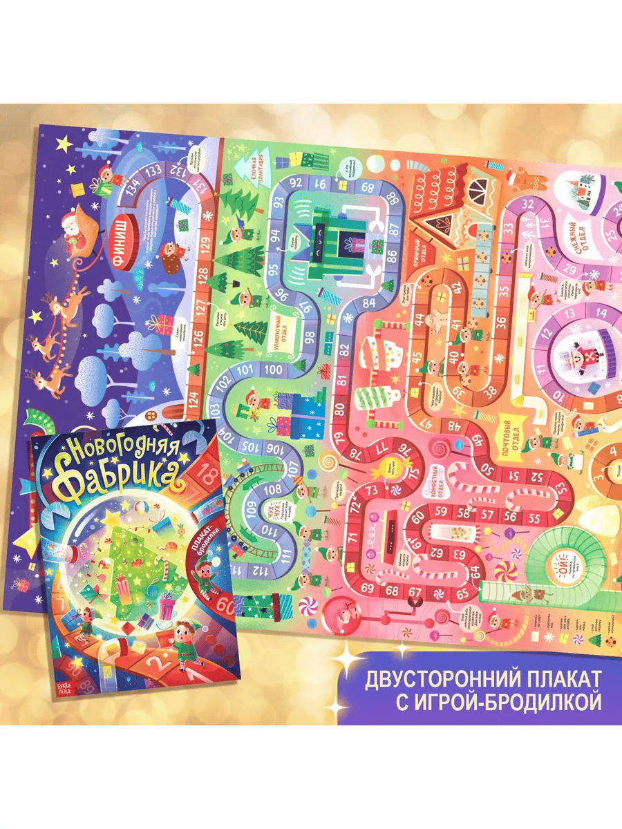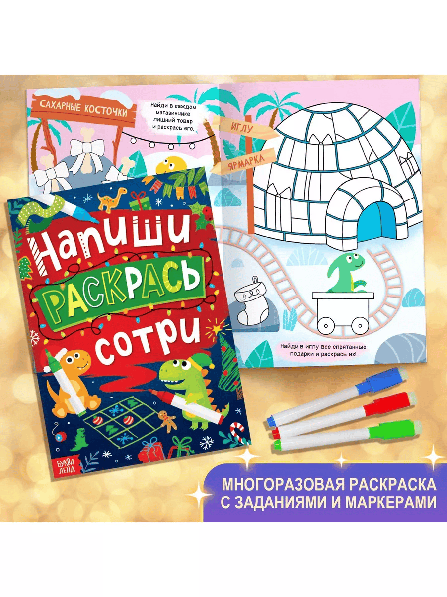 Что внутри? Квест со скретч-слоем. Случилось ужасное: пропали все письма и дети могут остаться без подарков! И только вы можете спасти Новый год! Стирайте скретч-слой, решайте задания и помогите маленьким эльфам найти письма. Книга с волшебной лупой. Решите все задания с помощью волшебной лупы, узнайте, как проходит подготовка к празднику и откройте все новогодние секреты! Волшебные снежинки. Вырезайте ажурные снежинки по готовым схемам прямо из книги и украшайте ими дом. Огромная бродилка-плакат для всей семьи. Вам понадобится только кубик и фишки, чтобы отправиться на прогулку по волшебной фабрике Дедушки Мороза. Добрая сказка с волшебным новогодним сюжетом заставит поверить в добро и чудеса. Новогодние мордашки — это весёлый альбом с наклейками, в котором можно будет придумать забавных героев, прилепив каждому смешной нос, глаза, рты и разные аксессуары. Будет весело! Загадки. Снеговичок приготовил много-много интересных загадок для новогоднего настроения. Также в новогоднем наборе вас ждут любимые хиты: зимние задачки, новогодняя раскраска, бумажные поделки (9 зимних фигурок), многоразовая книга с тремя разноцветными маркерами, альбом со 100 наклейками. Бонус! В наборе вы найдёте: Письмо, в котором ребёнок сможет рассказать Дедушке Морозу о своих желаниях, и они обязательно исполнятся. Большой волшебный пазл из 54 элементов на подложке из плотного картона, который поможет скрасить ожидание Нового года. Книги удобно и приятно дарить: они упакованы в красивую коробку. С новогодним набором БУКВА-ЛЕНД зимние каникулы пройдут весело и познавательно! Для маленьких читателей от 3 до 7 лет.