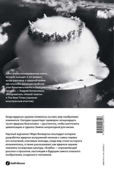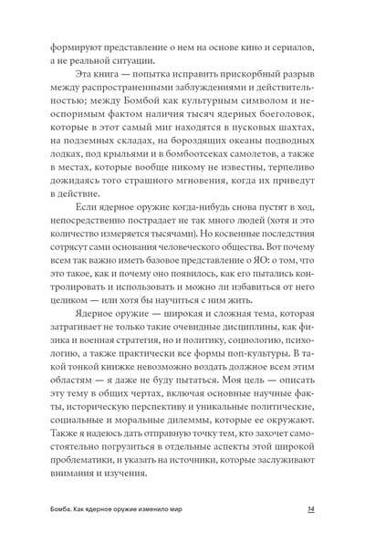 Когда ядерное оружие появилось на свет, мир необратимо изменился. Сегодня существует примерно четырнадцать тысяч ядерных боеголовок — достаточно, чтобы уничтожить цивилизацию и сделать Землю непригодной для жизни. Научный журналист Марк Волвертон исследует историю разработки ядерных вооружений начиная с самых первых его испытаний, ключевые эпизоды, когда мир стоял на пороге апокалипсиса, а также рассказывает, как ядерное оружие повлияло на мировую культуру. «Бомба» — отрезвляющий рассказ о прошлом, настоящем и будущем самого опасного изобретения, созданного человеком.