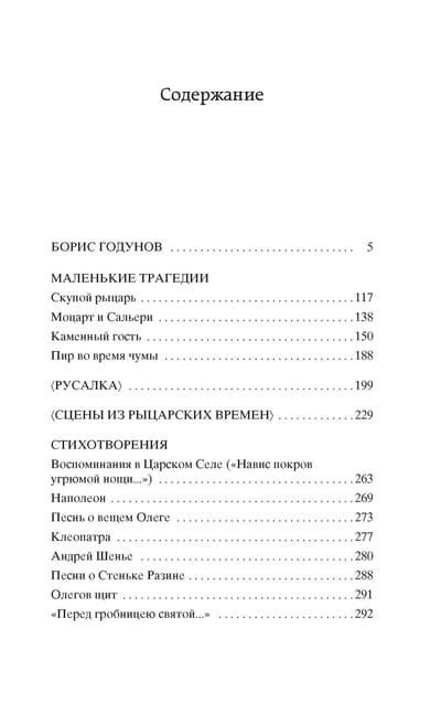 «Маленькие трагедии» и «Борис Годунов» — вершины русской драматургии первой половины XIX века. В 1825 году, находясь в ссылке в Михайловском, Пушкин пишет трагедию «Борис Годунов». «Изучение Шекспира, Карамзина и старых наших летописей дало мне мысль облечь в драматические формы одну из самых драматических эпох новейшей истории», — писал Пушкин о возникновении замысла сюжета, относящегося к эпохе Смуты. Завершив работу над пьесой, в которой главной темой стала борьба за власть и русский престол, поэт признавался в письме к своему другу П. А. Вяземскому: «Трагедия моя кончена; я перечел ее вслух, один, и бил в ладоши, и кричал, ай да Пушкин! ай да сукин сын!». Цикл «Маленькие трагедии» был написан в 1830 году в Болдине, он посвящен страстям человеческим — подчиняющим себе все мысли и чувства. Каждый главный герой одержим такой страстью — будь то стяжание сокровищ, любовь, творчество или жажда бессмертия. И каждый из них — добровольный раб своей страсти, которому мало подчинить ей свое личное бытие, он хочет подчинить ей весь мир. В издание включены и незавершенные драматические произведения Пушкина — «Русалка» и «Сцены из рыцарских времен», — а также избранные стихотворения.
