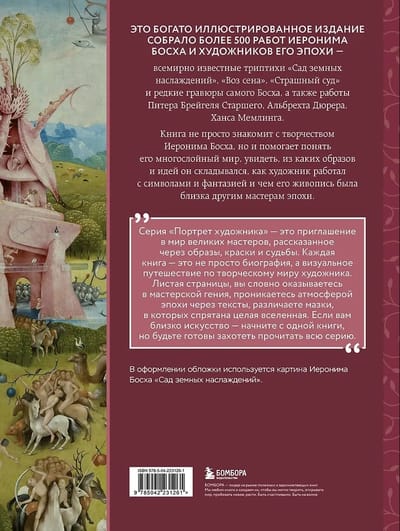 Книга подробно рассказывает о жизни и творчестве Иеронима Босха — мастера, чьи фантастические видения, аллегории и символы навсегда изменили представление о возможностях живописи. Через анализ его произведений раскрываются ключевые темы эпохи: борьба добра и зла, страхи и соблазны человека, религиозные представления Средневековья и раннего Возрождения. Особое внимание уделено главным шедеврам Босха — «Саду земных наслаждений», «Возу сена», «Кораблю дураков», «Страшному суду» и другим работам, наполненным множеством скрытых смыслов и деталей.