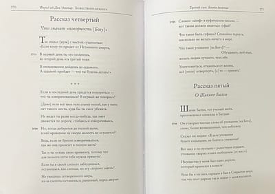 Сюжеты для историй ‘Аттар черпал отовсюду — в повседневной жизни, из рассказов покупателей и пациентов, приходивших в его аптечную лавку, из историй о святых людях, которыми он восхищался ещё в детстве, из множества книг, устных преданий и сказок.