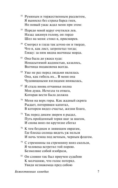 Прошли века. Политическая злободневность «Божественной комедии» давно пропала, но остались и бессмертная красота языка Данте, и мощь его литературного таланта, и сила философской мысли, предвосхитившей духовные и нравственные искания гуманистических гениев Возрождения.