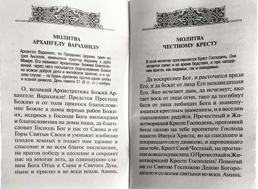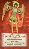 В брошюру «Брань духовная», напечатанную гражданским шрифтом, помимо известных молитв, включен древний Канон и молитва святому Архангелу Михаилу Грозному Воеводе Небесных Сил, к которому мы можем обращаться келейно, как к сугубому защитнику Православной веры и Ангелу Хранителю Руси. Святой Архангел Михаил — «прогонитель демонов», покровитель властей и государства русского, — скорый и верный помощник и заступник каждого, кто в бедах, скорбях и недугах обращается к нему за исцелением и заступничеством от действий нечистой силы.