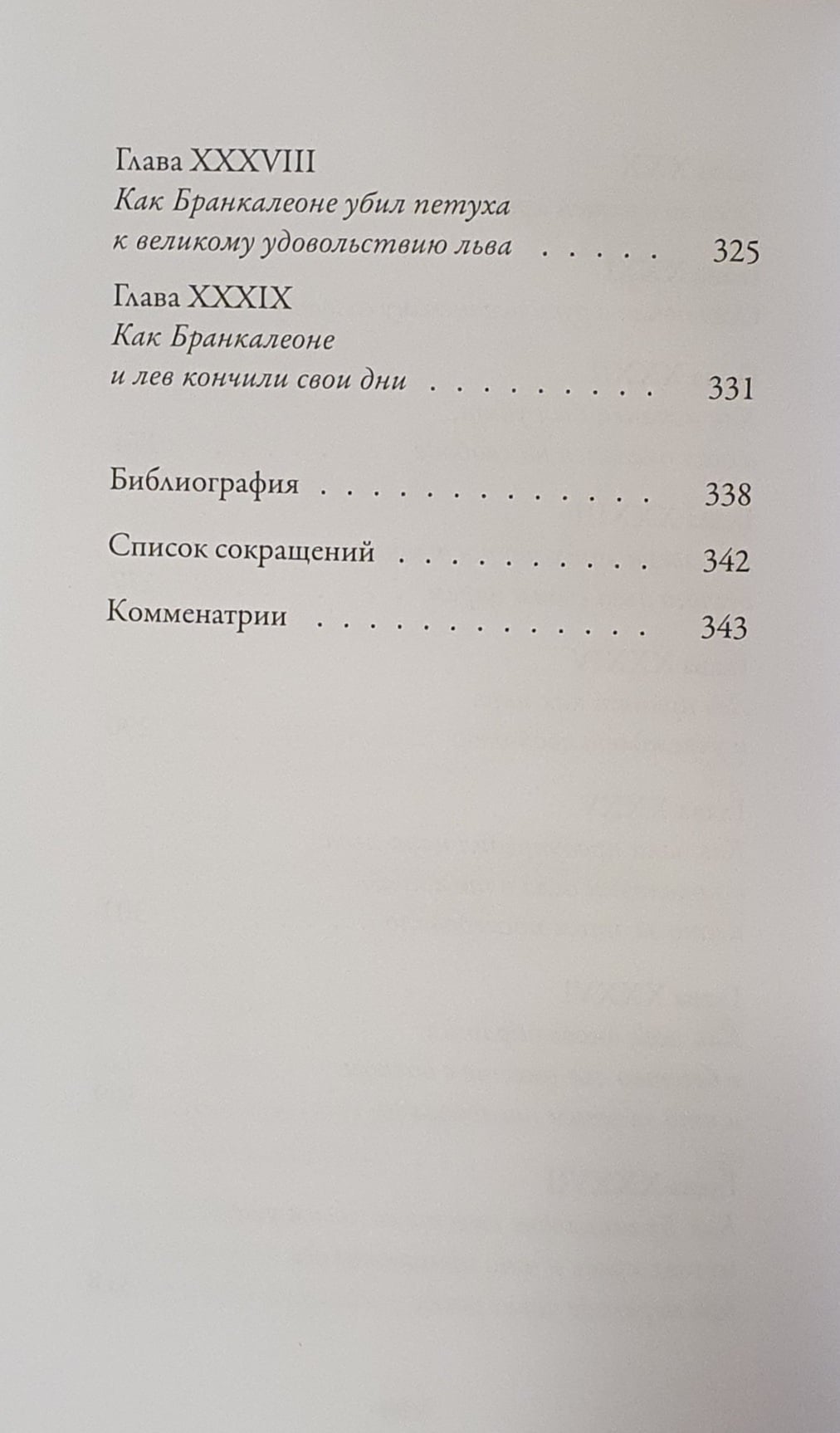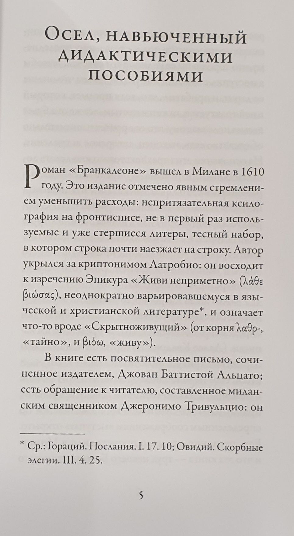 Итальянская романистика XVII века богата, интересна и совершенно неизвестна читателю. «Бранкалеоне» — первый ее образец, появляющийся в русском переводе. Его можно назвать романом воспитания, только посвящен он воспитанию... осла. Главный герой, в юности проданный из родительского стойла, переходит от одного хозяина к другому, выслушивая несметное множество историй, которые должны научить его уму-разуму, в то время как автор дает его приключениям морально-политическое толкование, чтобы научить читателя. Сюжетная основа — странствия разумного осла — взята из романа Апулея; вставные новеллы — из басен Эзопа, плутовской словесности и других источников; этот причудливый сплав разнородных элементов ставит «Бранкалеоне» где-то между романом и жанром, хорошо знакомым итальянской литературе, — обрамленным сборником новелл.