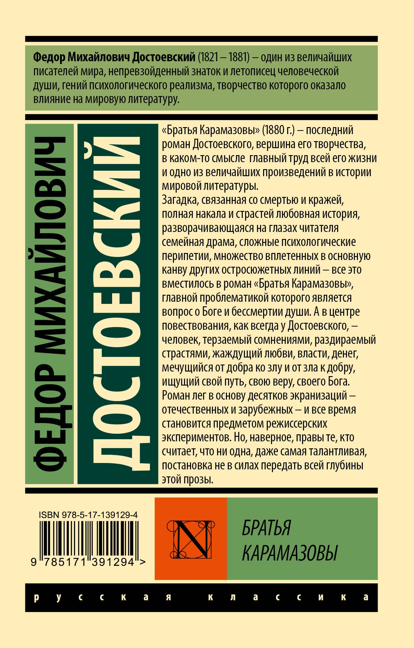 Загадка, связанная со смертью и кражей, полная накала и страстей любовная история, разворачивающаяся на глазах читателя семейная драма, сложные психологические перипетии, множество вплетенных в основную канву других остросюжетных линий — все это вместилось в роман «Братья Карамазовы», главной проблематикой которого является вопрос о Боге и бессмертии души. А в центре повествования, как всегда у Достоевского, — человек, терзаемый сомнениями, раздираемый страстями, жаждущий любви, власти, денег, мечущийся от добра ко злу и от зла к добру, ищущий свой путь, свою веру, своего Бога.