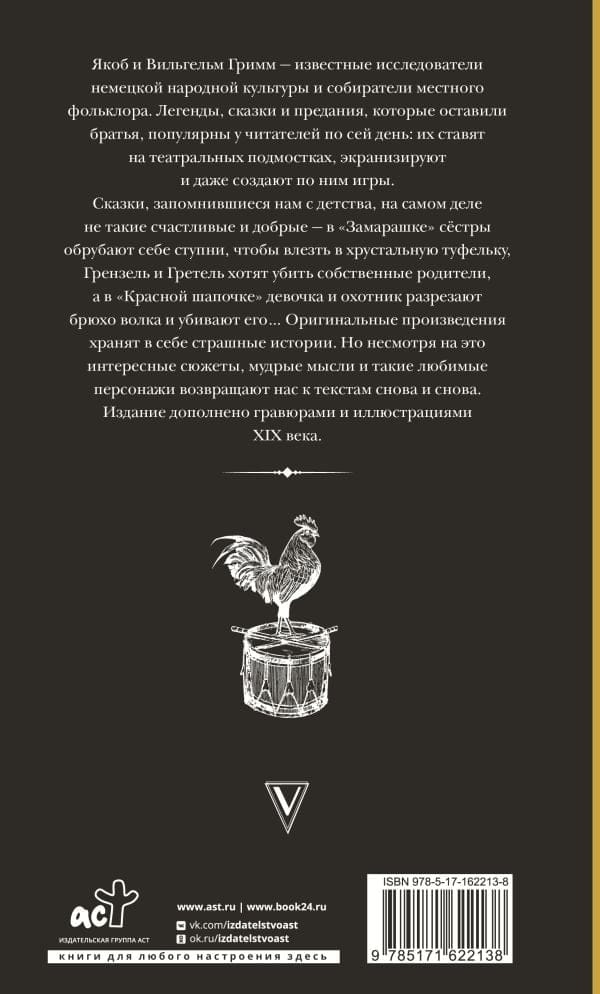 Сказки, запомнившиеся нам с детства, на самом деле не такие счастливые и добрые — в «Замарашке» сёстры обрубают себе ступни, чтобы влезть в хрустальную туфельку, Грензель и Гретель хотят убить собственные родители, а в «Красной шапочке» девочка и охотник разрезают брюхо волка и убивают его… Оригинальные произведения хранят в себе страшные истории. Но несмотря на это интересные сюжеты, мудрые мысли и такие любимые персонажи возвращают нас к текстам снова и снова. Издание дополнено гравюрами и иллюстрациями XIX века.