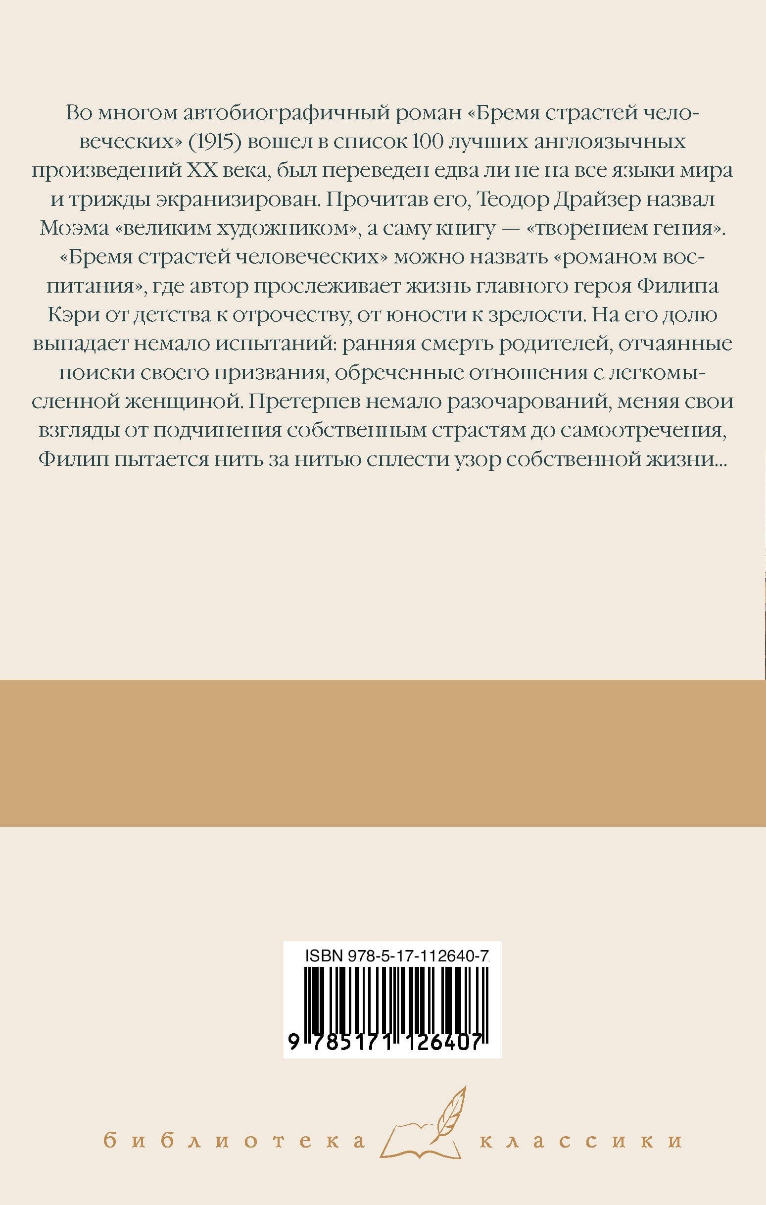 «Бремя страстей человеческих» можно назвать «романом воспитания», где автор прослеживает жизнь главного героя Филипа Кэри от детства к отрочеству, от юности к зрелости. На его долю выпадает немало испытаний: ранняя смерть родителей, отчаянные поиски своего призвания, обреченные отношения с легкомысленной женщиной. Претерпев немало разочарований, меняя свои взгляды от подчинения собственным страстям до самоотречения, Филип пытается нить за нитью сплести узор собственной жизни…