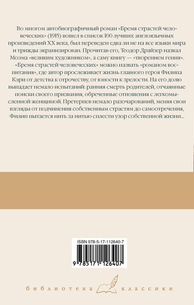 Во многом автобиографичный роман «Бремя страстей человеческих» (1915) вошел в список 100 лучших англоязычных произведений XX века, был переведен едва ли не на все языки мира и трижды экранизирован. Прочитав его, Теодор Драйзер назвал Моэма «великим художником», а саму книгу — «творением гения».
