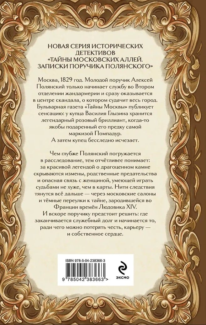 Москва, 1829 год. Молодой поручик Алексей Полянский только начинает службу во Втором отделении жандармерии и сразу оказывается в центре скандала, о котором судачит весь город. Бульварная газета «Тайны Москвы» публикует сенсацию: у купца Василия Глызина хранится легендарный розовый бриллиант, когда-то якобы подаренный его предку самой маркизой Помпадур. Одной статьи оказывается достаточно, чтобы спокойный дом превратился в осаждённую крепость — к нему устремляются журналисты, авантюристы и охотники за лёгкой наживой. А затем купец бесследно исчезает.
