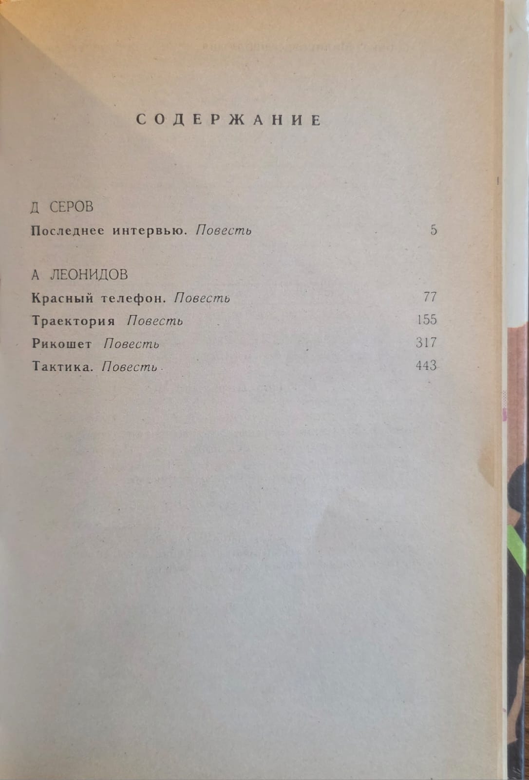 Сборник представляет читателям обнаженно правдивую, остро современную, увлекательную криминальную повесть замечательного писателя-новосибирца Д.Серова «Последнее интервью» и цикл детективных повестей известных мастеров остросюжетного жанра Леонида Шувалова и Александра Ярушкина (А.Леонидов)