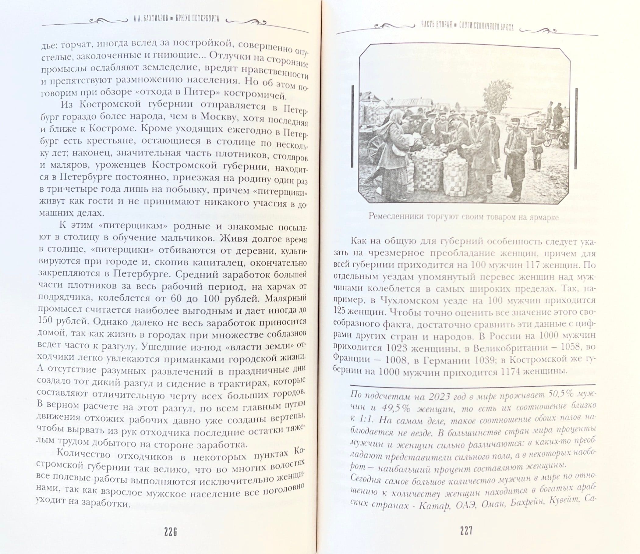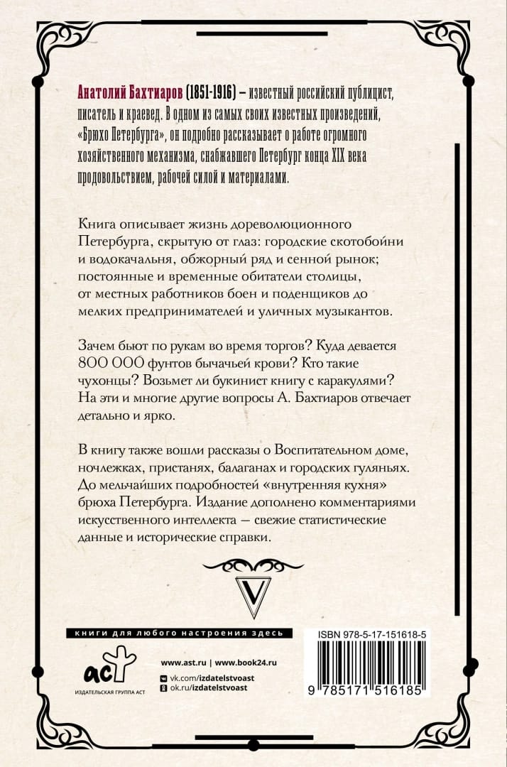 Книга описывает жизнь дореволюционного Петербурга, скрытую от глаз: городские скотобойни и водокачальня, обжорный ряд и сенной рынок; постоянные и временные обитатели столицы, от местных работников боен и поденщиков до мелких предпринимателей и уличных музыкантов. Зачем бьют по рукам во время торгов? Куда девается 800 000 фунтов бычачьей крови? Кто такие чухонцы? Возьмет ли букинист книгу с каракулями? На эти и многие другие вопросы А. Бахтиаров отвечает детально и ярко. В книгу также вошли рассказы о Воспитательном доме, ночлежках, пристанях, балаганах и городских гуляньях. До мельчайших подробностей «внутренняя кухня» брюха Петербурга. Издание дополнено комментариями искусственного интеллекта — свежие статистические данные и исторические справки.