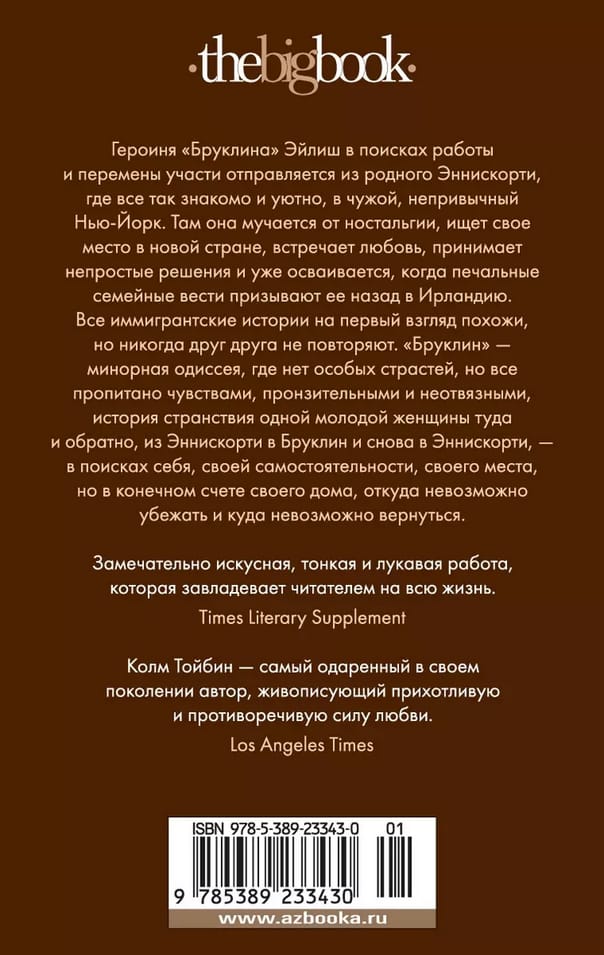 Колм Тойбин — одна из крупнейших фигур современной ирландской литературы, тонкий и многообразный писатель, чьи книги неоднократно попадали в шорт-лист «Букера» и удостаивались значимых литературных наград. За «Бруклин», тихую историю молодой женщины и ее поисков себя, где чувства бурлят в глубине и всплывают на поверхность лишь рябью, намеком, недоговоренностью, автор получил Премию Коста, а в 2015 году Джон Краули экранизировал этот роман по сценарию, написанному совместно Тойбином и Ником Хорнби. Героиня «Бруклина» Эйлиш в поисках работы и перемены участи отправляется из родного Эннискорти, где все так знакомо и уютно, в чужой, непривычный Нью-Йорк. Там она мучается от ностальгии, ищет свое место в новой стране, встречает любовь, принимает непростые решения и уже осваивается, когда печальные семейные вести призывают ее назад в Ирландию. Все иммигрантские истории на первый взгляд похожи, но никогда друг друга не повторяют. «Бруклин» — минорная одиссея, где нет особых страстей, но все пропитано чувствами, пронзительными и неотвязными, история странствия одной молодой женщины туда и обратно, из Эннискорти в Бруклин и снова в Эннискорти, — в поисках себя, своей самостоятельности, своего места, но в конечном счете своего дома, откуда невозможно убежать и куда невозможно вернуться.