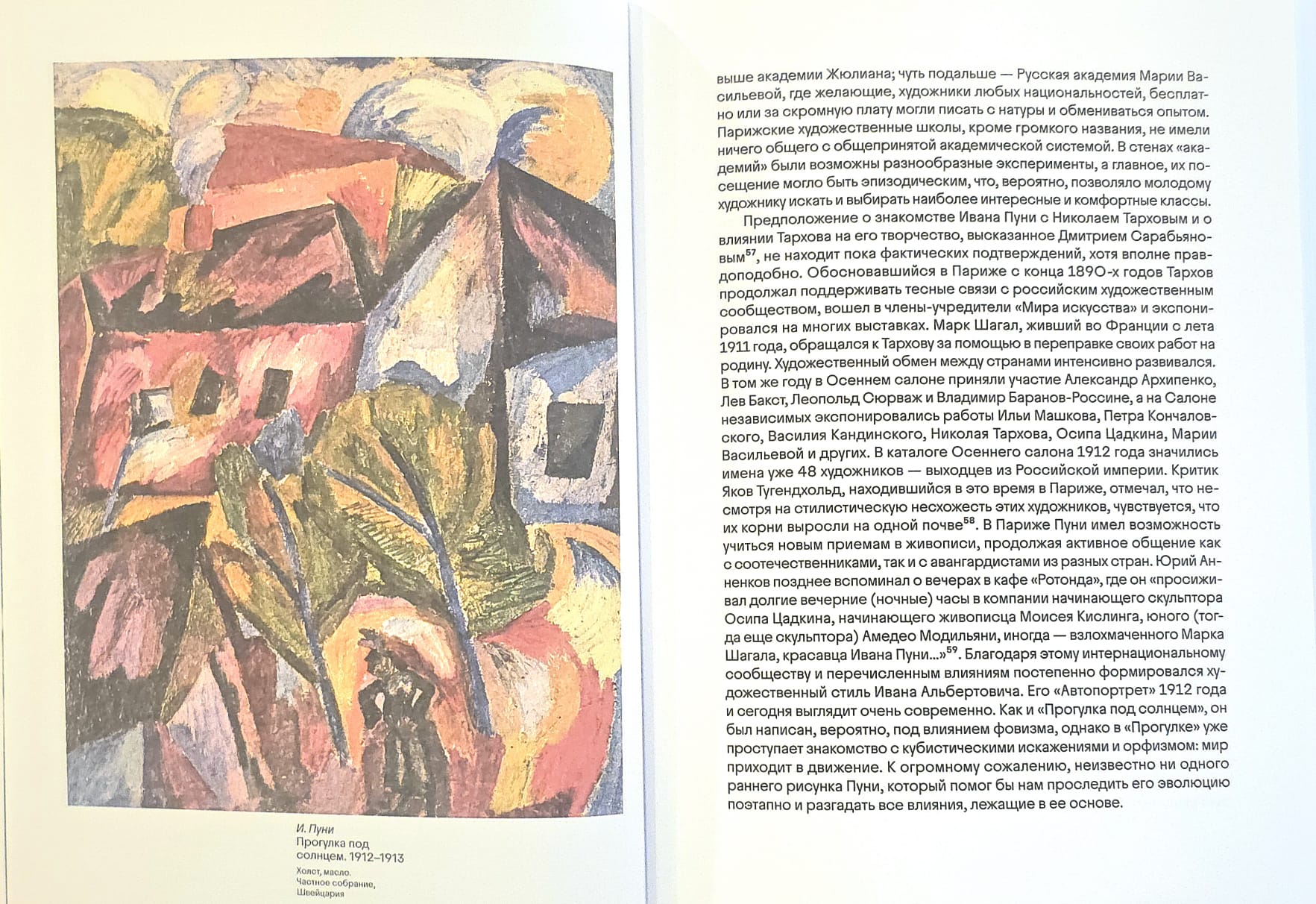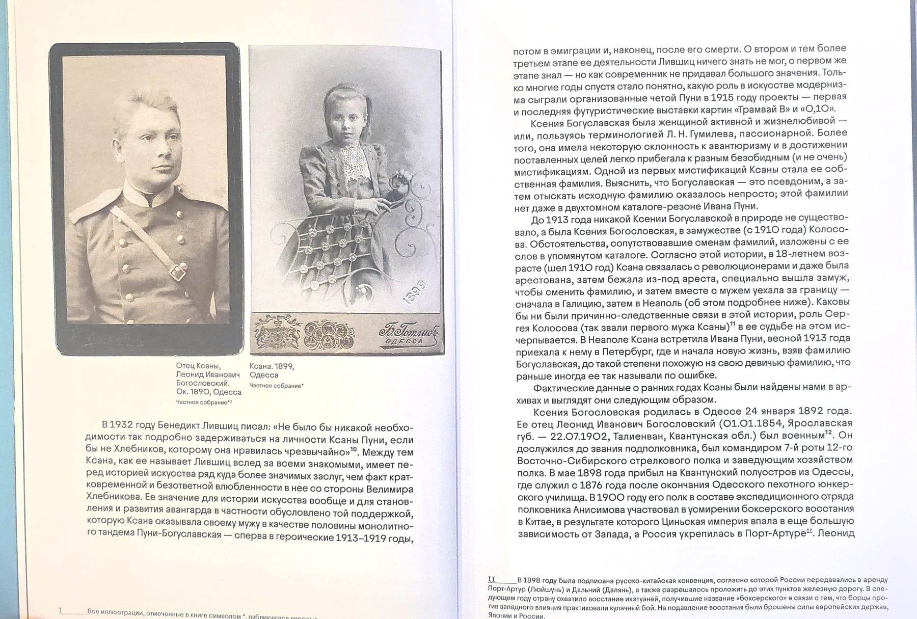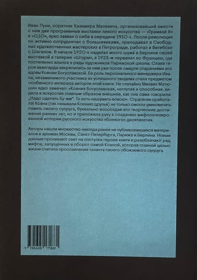 Иван Пуни, соратник Казимира Малевича, организовавший вместе с ним две программные выставки левого искусства «Трамвай В» и «0,10», ярко заявил о себе в середине 1910-х годов. После революции он активно сотрудничал с большевиками, преподавал в Государственных свободных художественных мастерских в Петрограде, работал в Витебске с Марком Шагалом. В начале 1920-х наделал много шума в Берлине своей выставкой в галерее «Штурм», в 1923 году переехал во Францию, где постепенно влился в ряды художников Парижской школы. Слава героя авангарда закрепились за ним уже после смерти стараниями его вдовы Ксении Богуславской. Ее роль персонального менеджера художника, незаменимого участника их успешного тандема стала предметом особенного интереса авторов книги. Не случайно Михаил Матюшин едко замечал: «Ксения Богуславская, неглупая и способная, видела в искусстве главным образом внешнее, как она сама говорила: Надо сделать бу-мм. То есть нашуметь вовсю». Стратегия сработала: Ксана (так называли ее друзья) смогла не только увековечить память супруга, буквально воссоздав его творческие достижения ранних лет, но и приложила руку к созданию мифологизированной истории русского искусства «боевого» десятилетия.