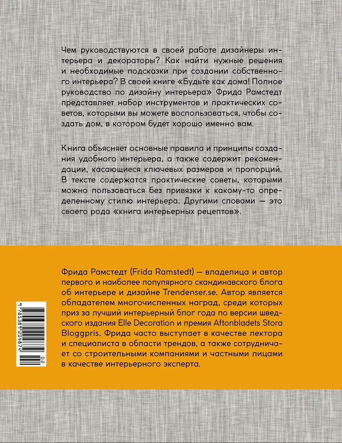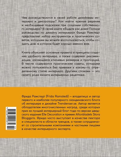 На какой высоте повесить светильник над обеденным столом? Как расставить мебель в гостиной? Какое расстояние оставить между кроватью и шкафом? На все эти практические вопросы автор дает аргументированные ответы. Практические рекомендации, изложенные простым понятным языком, — ценная и редкая вещь в мире дизайна интерьера. Вся суть в мелочах. В больших вопросах мы разберемся и сами, но профессионала от любителя отличает знание мелочей. Именно этими «важными мелочами» и делится автор книги. Издать книгу по интерьеру без фотографий — решение смелое и даже революционное. Наш мир переполнен вдохновляющими картинками уютных интерьеров. Хотелось бы только знать, КАК воплотить в жизнь всю эту красоту. «Полное руководство по дизайну интерьера» Фриды Рамстедт дает ответ. Книга расположилась ровно между красочными изданиями с вдохновляющими интерьерными картинками и сухой профессиональной литературой по строительству и архитектуре.
