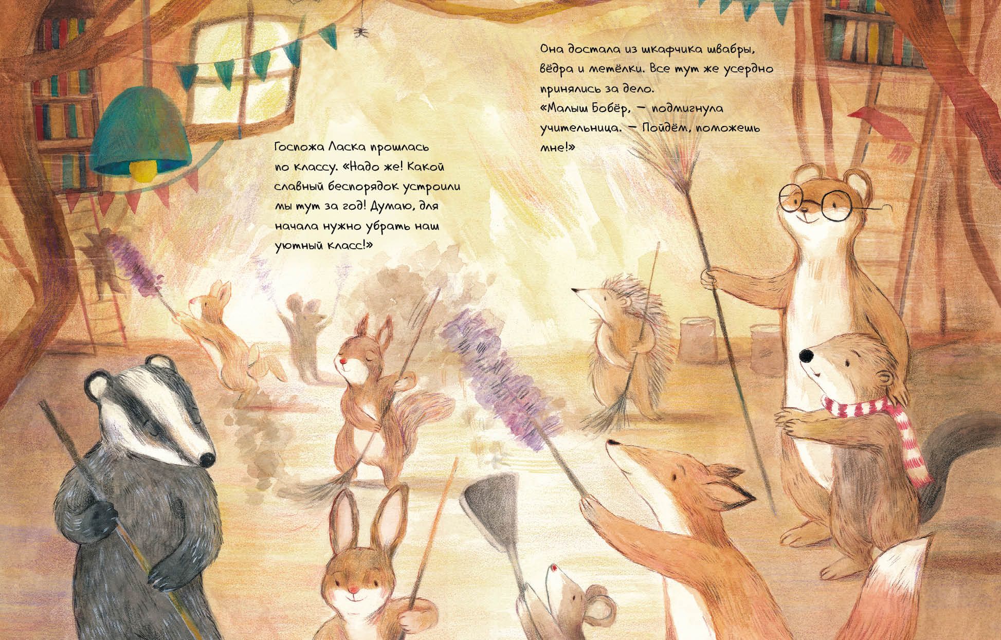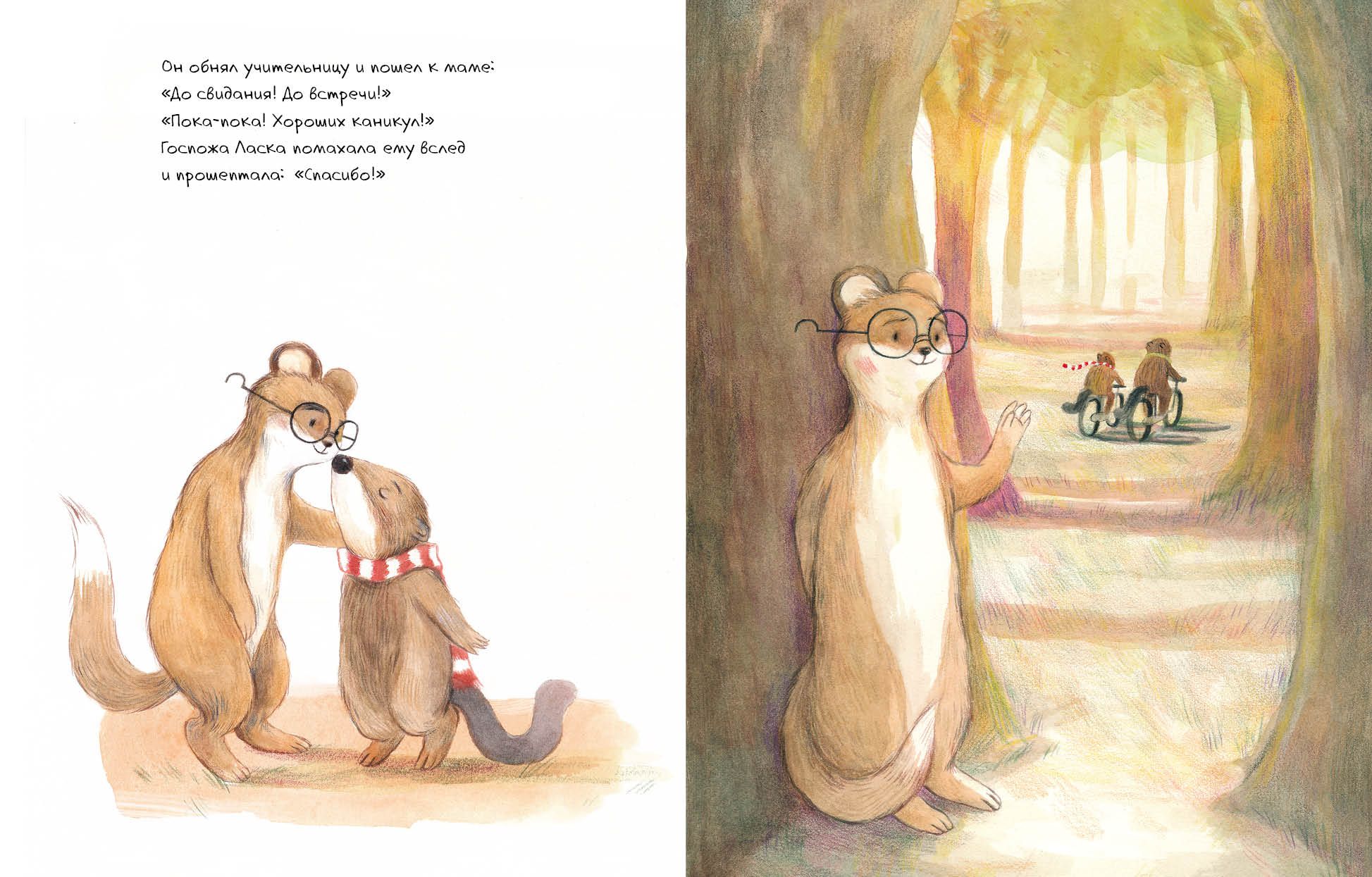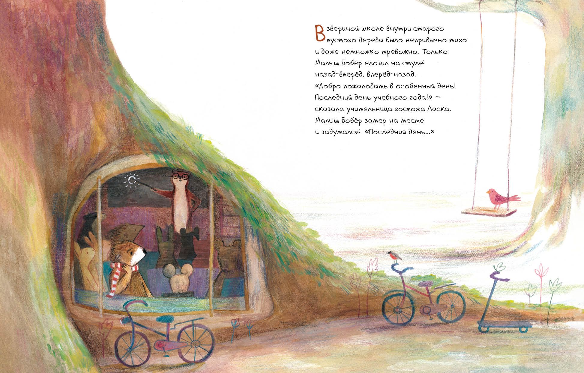 Вот и настал последний день учёбы. Все зверята счастливы и ждут каникул. И только Малыш Бобёр грустит – он не хочет прощаться. К счастью, любимая учительница знает, как его развеселить. Трогательная и добрая история о завершении учебного года, расставании и надежде.