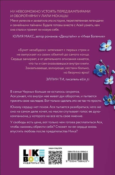 Лили Мокашь — очень популярный автор и по совместительству еще и книжный блогер. Ее обзоры, отзывы и книжный клуб горячо любимы Young Adult аудиторией. «Букет незабудок» — вторая часть ее вампирской трилогии о любви, взрослении и борьбе двух противоположностей, которые все-таки притягиваются.