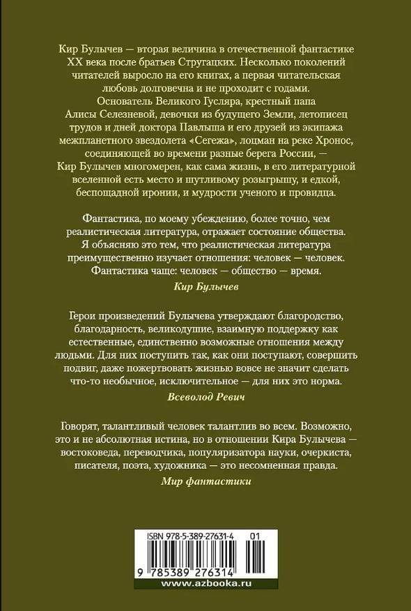 Кир Булычев — вторая величина в отечественной фантастике XX века после братьев Стругацких. Несколько поколений читателей выросло на его книгах, а первая читательская любовь долговечна и не проходит с годами. Основатель Великого Гусляра, крестный папа Алисы Селезневой, девочки из будущего Земли, летописец трудов и дней доктора Павлыша и его друзей из экипажа межпланетного звездолета «Сегежа», лоцман на реке Хронос, соединяющей во времени разные берега России, — Кир Булычев многомерен, как сама жизнь, в его литературной вселенной есть место и шутливому розыгрышу, и едкой, беспощадной иронии, и мудрости ученого и провидца.