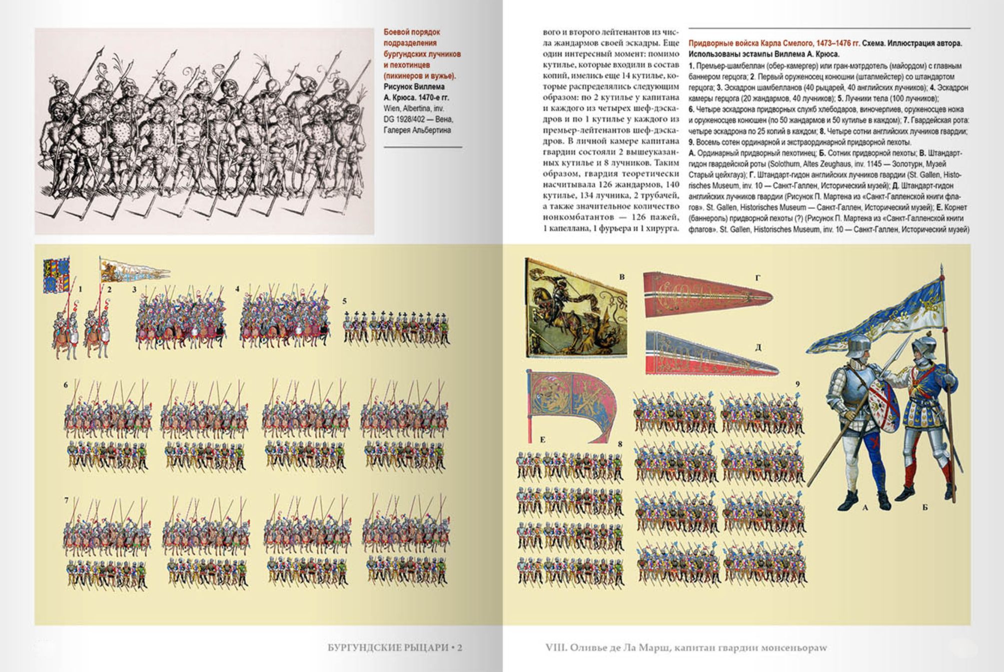 Книга традиционно снабжена богатейшим иллюстративным рядом, визуально погружающим читателя в пышную эпоху «осени Средневековья». Текст сопровождают авторские картины и многочисленные реконструкции внешнего вида воинов, их вооружения, ливрей и знамен. Красочные планшеты демонстрируют жандармов, лучников и пехотинцев не только Бургундии, но также Франции, Англии, Священной Римской империи, Швейцарии и Льежского княжества. Описания битв, осад и походов дополнены подробными картами и схемами боевых действий, тактических построений и военной организации.